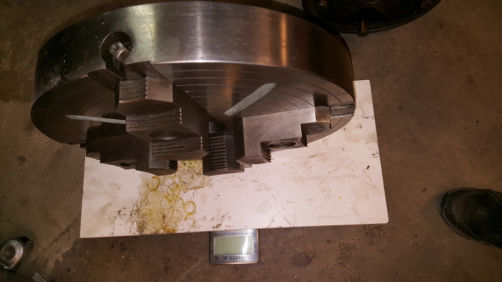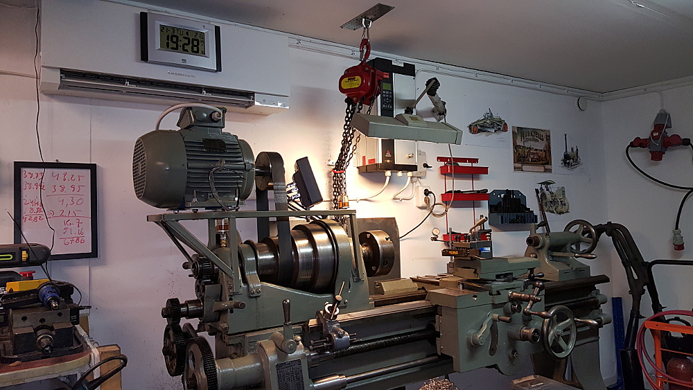 För att få på en 60 kg 4-backskiva med utsträckta armar behöver man väga betydligt mer än jag gör för att inte ramla framåt och få en snoksmäll av svarven. Det är trots allt 15 kg mer än en MCB Compact som skivan väger. Så jag har parkerat ett kedjeblock i taket som gör det enkelt att montera.