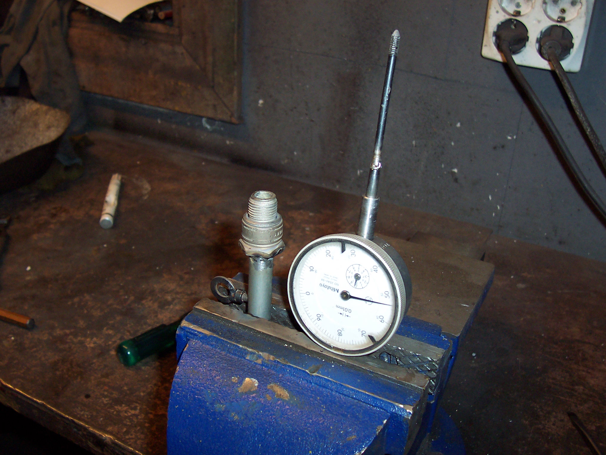 Jag har mycket stor nytta av att ha en svarv och för någon dag sedan gjorde jag en hållare för indikatorklocka att mäta kolvhöjd med när man ställer in tändningen. Syftet var kanske mest att se om jag kunde göra en fin M14*1.25 gänga i svarven och det gick bra.