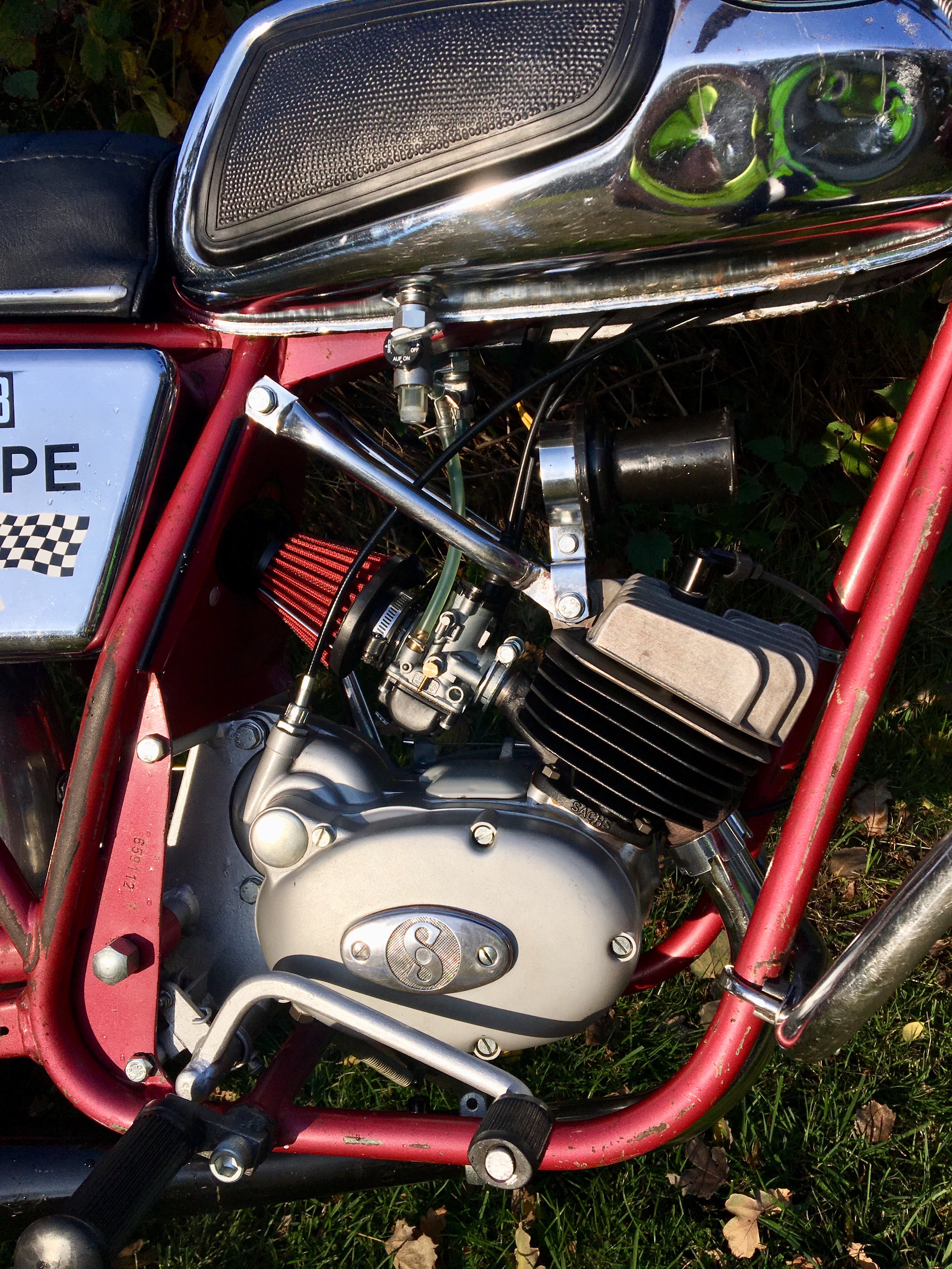 En liten update, kört ca 50+mil med bågen och har gjort en del sen sist, bestyckat om förgasaren (nödvändigt givetvis) nytt luftfilter ( hade skumfilter först men tyckte de drog in lite väl mkt skit trots insmörjning) klyvt motorn 1 gång pga en slarv miss, honat cylindern pga värmenypningar, va nyborrad av förra ägaren men efter närmare kontroll va de lite väl tajt. Kört 15mil efter nu och de verkar funkar utmärkt. Drevat om den fram och bak. 14T fram och 38T bak. Blir och special tillverka något mitt emellan 34-38 mest troligt. Hunnit med en punka också samt lite annat finlir och kosmetiska ändringar ;) ..