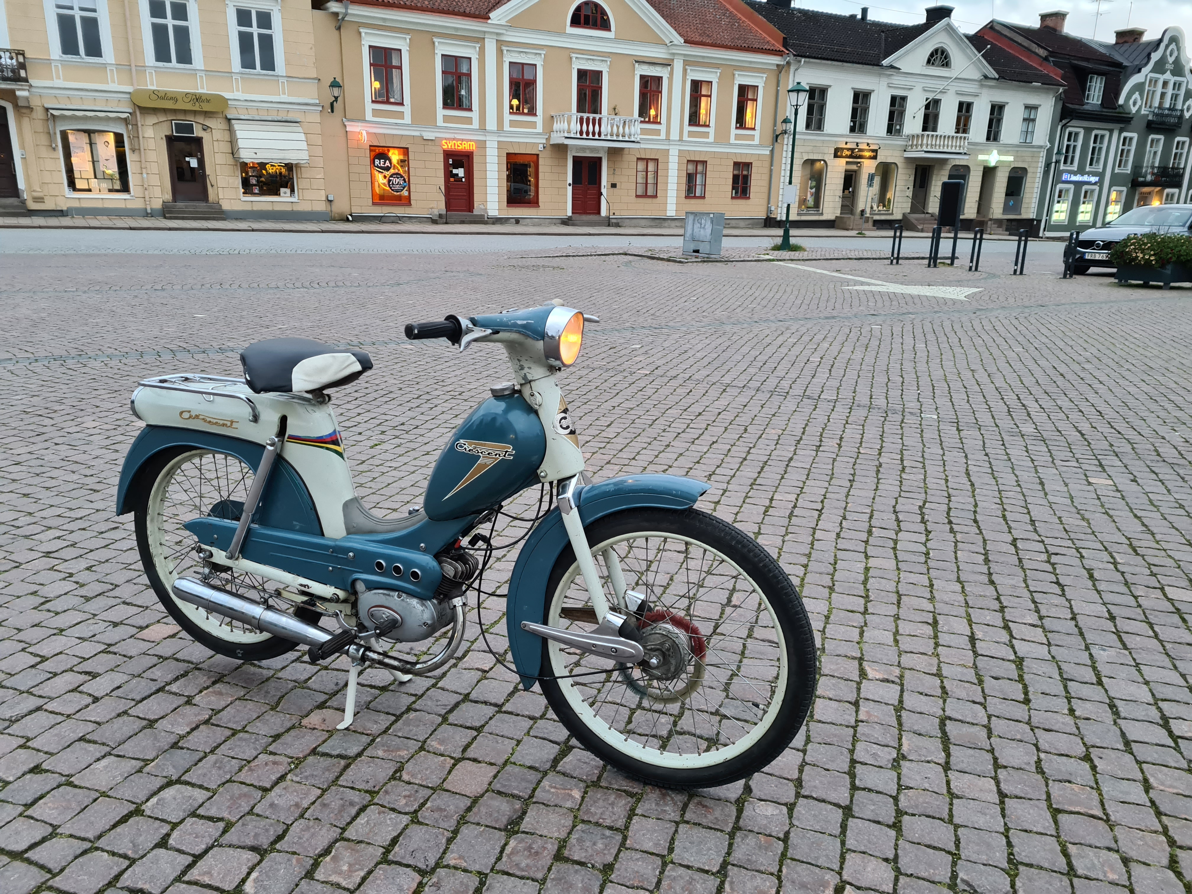 Är utrustad med 5hk parmakit och äkta 16mm bing samt 13 kugg fram. För 50-55 km/h på plan mark.