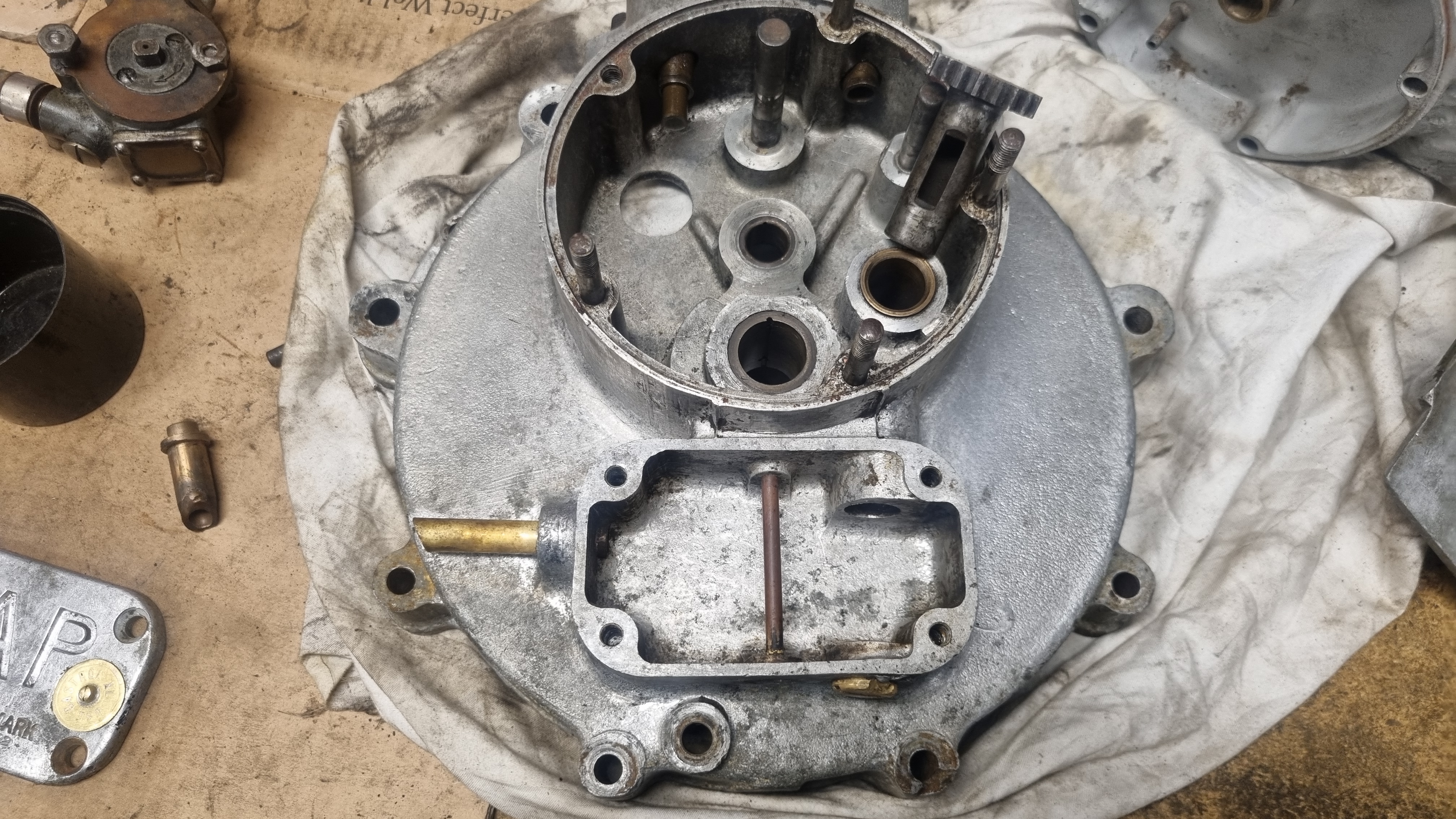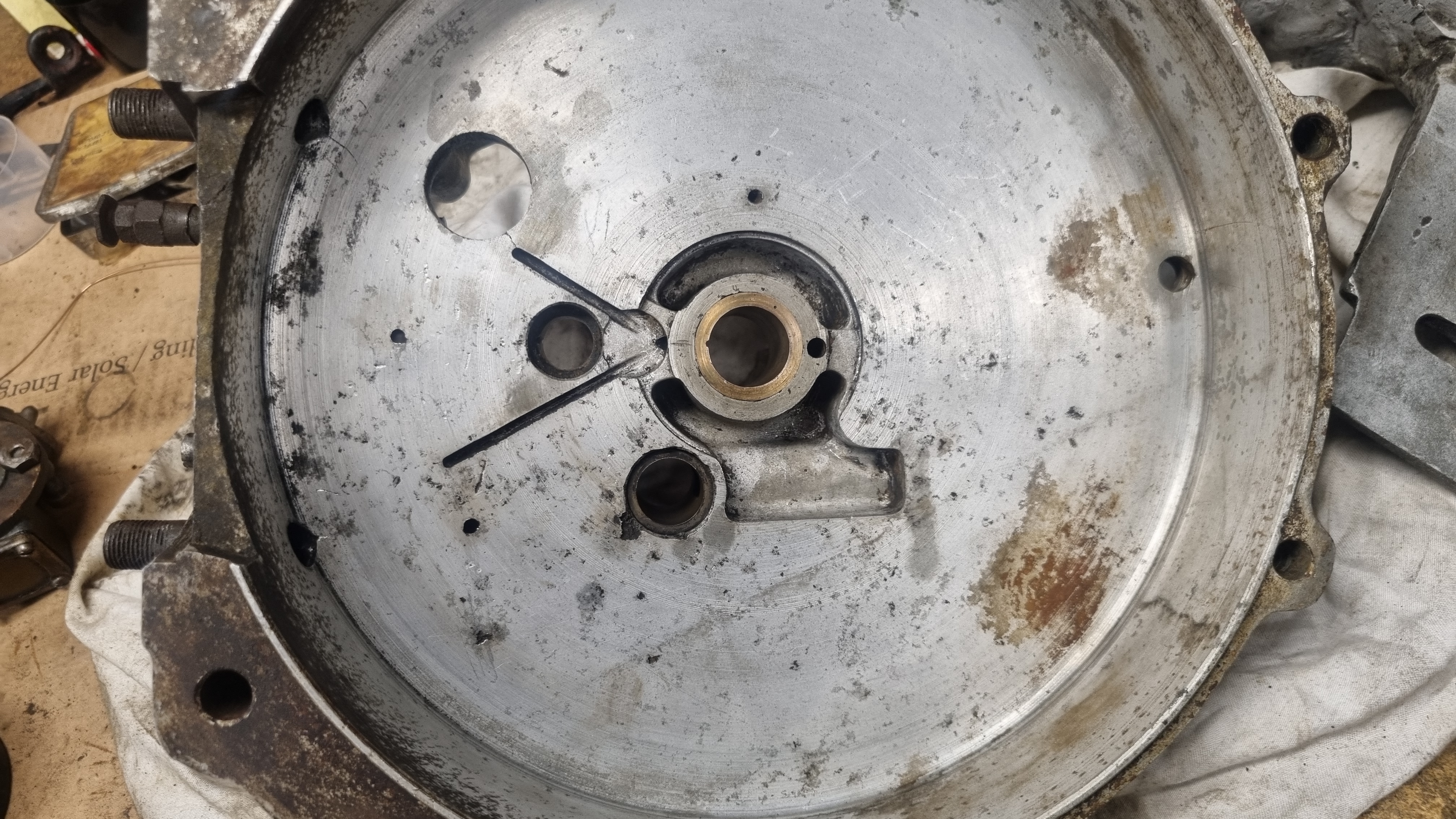 Oljepumpen fyller på kamaxelhuset och oljan som blir över när nivån är för hög hamnar på backen genom röret till vänster.