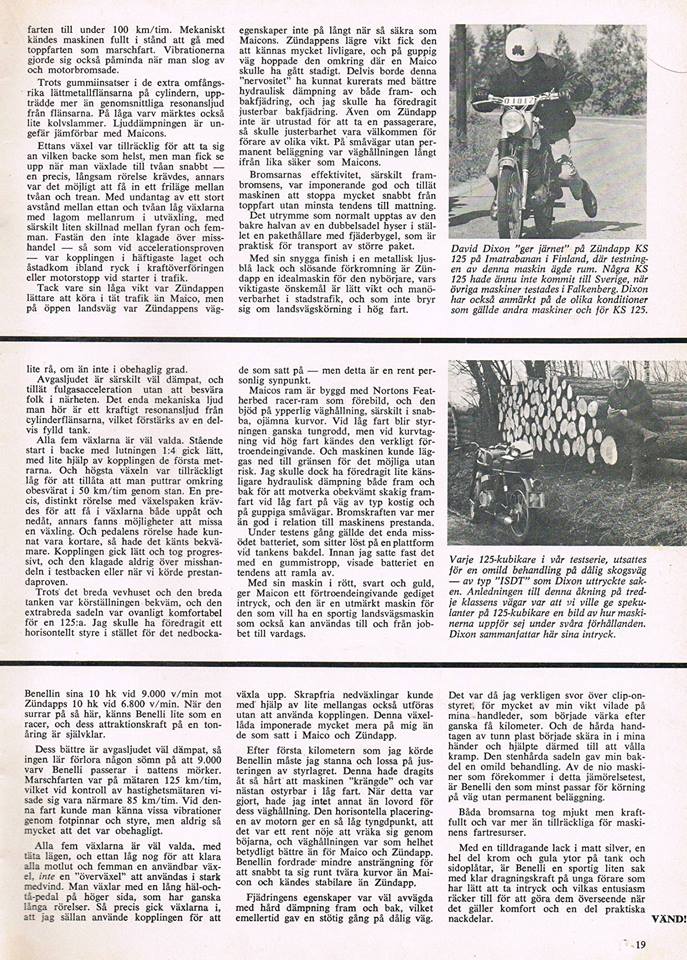 I reportaget stod också att motorn vibrerade nästan inget i toppfart så frågan är om det var en följa av att motorn var nedtrimmad och inte bara motorupphängningen. Samma ram med 100cc motorn körde jag en hel del med runt -63 och jag minns inte att den vibrerade något speciellt... Däremot minns jag att den gick som ett spjut med dåtida mått men om man skjutsade på den tappade den orken så vridet var lite klent, säkert bättre på 125an