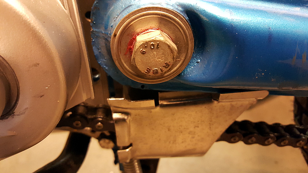 Svingaxeln utbytt till en original RIBE i hållfasthetsklass 10.9. Det är säkert en betydligt starkare axel än Kina-dito som jag har haft. Den nya axeln fettades in ordentligt innan den monterades. En annan bonuseffekt är att den har rätt diameter så att det inte blir ett litet glapp i svingen som det blir med Kina-axeln som är flera tiondelar för smal. Samma åtgärd gjordes på båda Zundapparna.