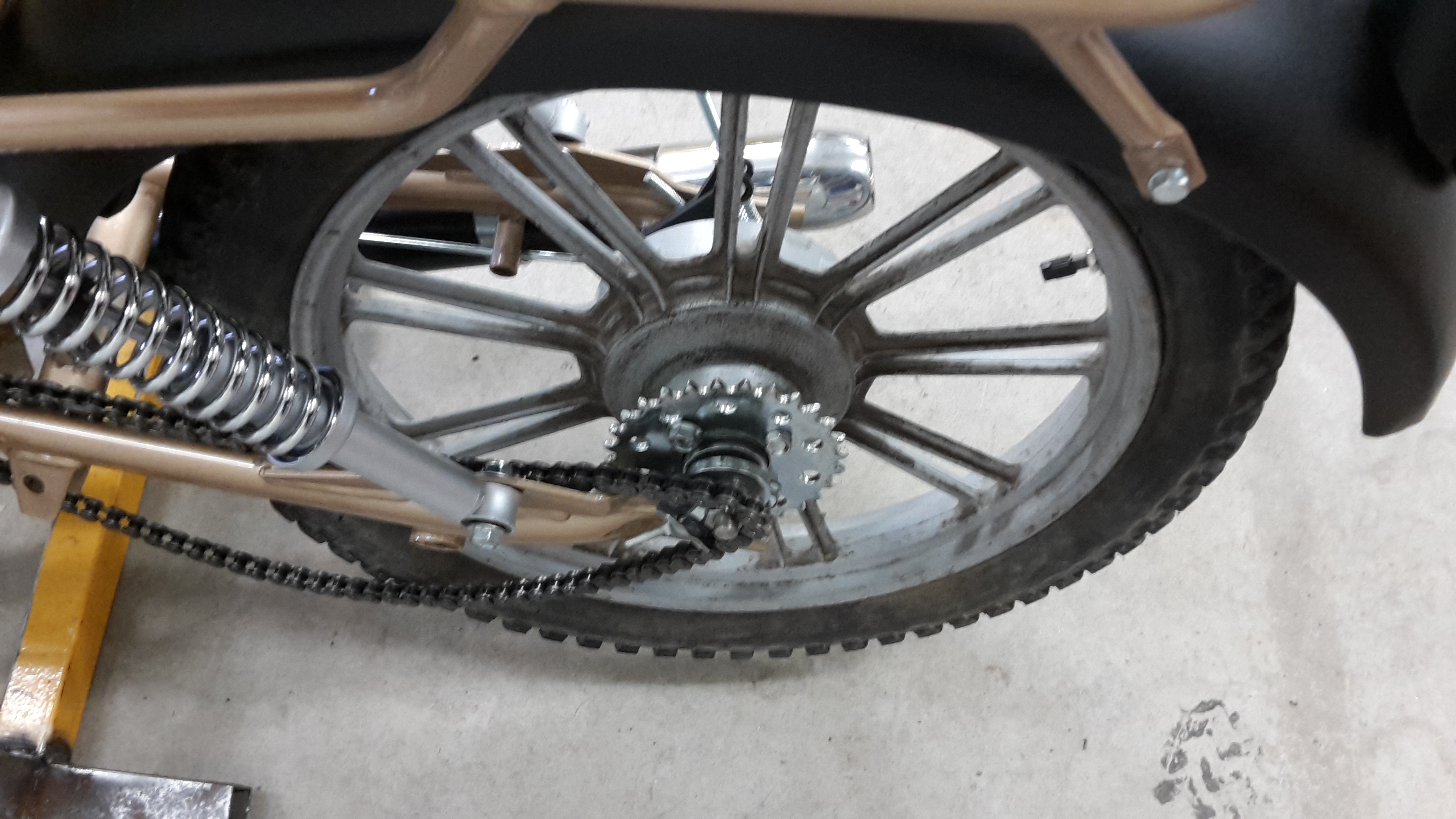 Detta hände efter första lilla provturen ut på gatan! Bakhjulet lossnade när jag bromsade lite grann, ganska odramatiskt men det kunde gått riktigt illa, vad hade hänt om jag åkt i gatan med moppen!