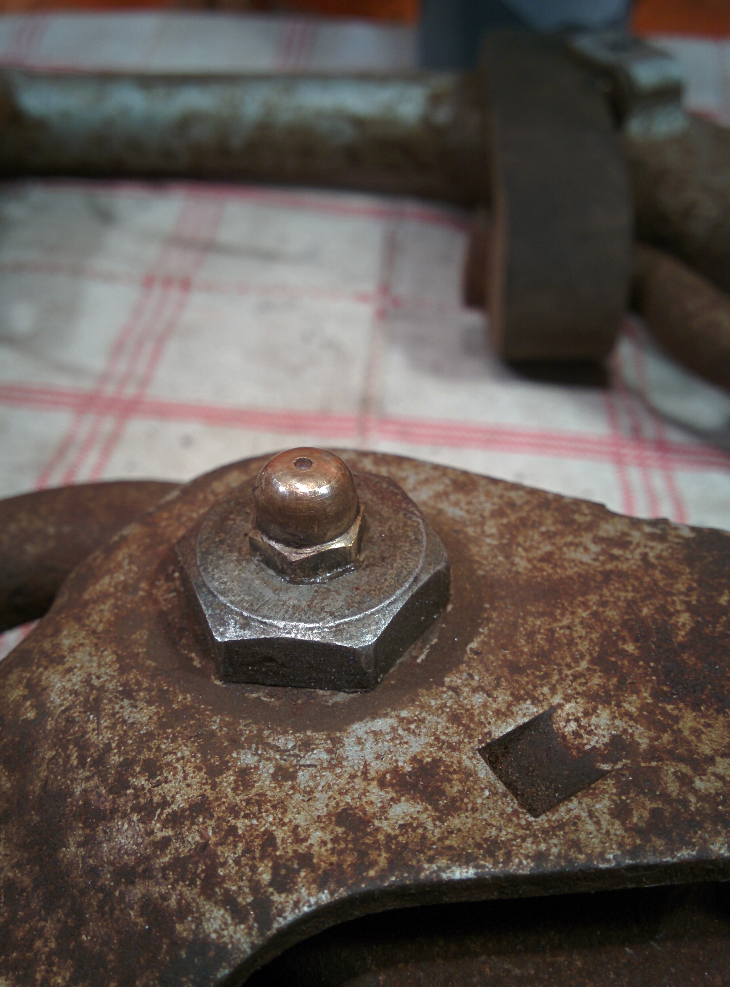 Ett knep jag har för att inte få en massa blanka skruvskallar och muttrar överallt är att lägga bultarna i fosforsyra över natten. Då får dom en matt, mörkgrå ton istället vilket smälter in bra. Jag köper ett kalklösningsmedel på ÖoB som jag lägger dom i, outspätt.