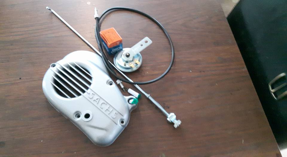 Idag kom i alla fall paketet från Ettan hade inte gjort något om det kommit i fredags men i med att söndagen inte bjöd på byggtid kan jag erkänna att delarna var inte någon panik med!! Men en lustig sak blinkersreläet stämmer då rakt inte överens med askens elschema lustigt värre!! Jaja ingen raketforskning men nog var det ändå mer än lite udda!! Är ändå bland annat elektriker så tror jag löser trådarna ändå men kan nog finnas några som kliar sig när de öppnar paketet.. Men nu sover barnen så fått lackat kåpan eller tja lite av den ännu inte riktigt bestämt mig hur den ska bli!! Oftast brukar jag rätt snabbt få en vision och sedan köra på det spåret men inte denna gången!! Antingen hela fältet silver som nu!! Med tanke på att matcha andra sidans kåpa där lilla locket är silver!! Eller lacka kåpan svart och slipa fram Sachs i silver!!(lutar åt den versionen men måste se motorn på ramen innan beslutet avgörs). Som sista alternativ måla Sachs grönt och kåpan svart men här mer tveksam mister själva motorns helhet då skulle lilla kåpan behöva vara grön och det vill jag inte!! Ja detaljer är en ständig pågående process väntar fortfarande på två detaljer baklampa och sidoväskor sidoväskor viktiga då dessa ska få lite personlighet och både sys som byggas om för passa. Baklampan viktig för att få fast väskorna så hand i hand går de och allt jag kan göra är vänta...(ja å allt annat)