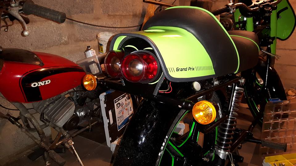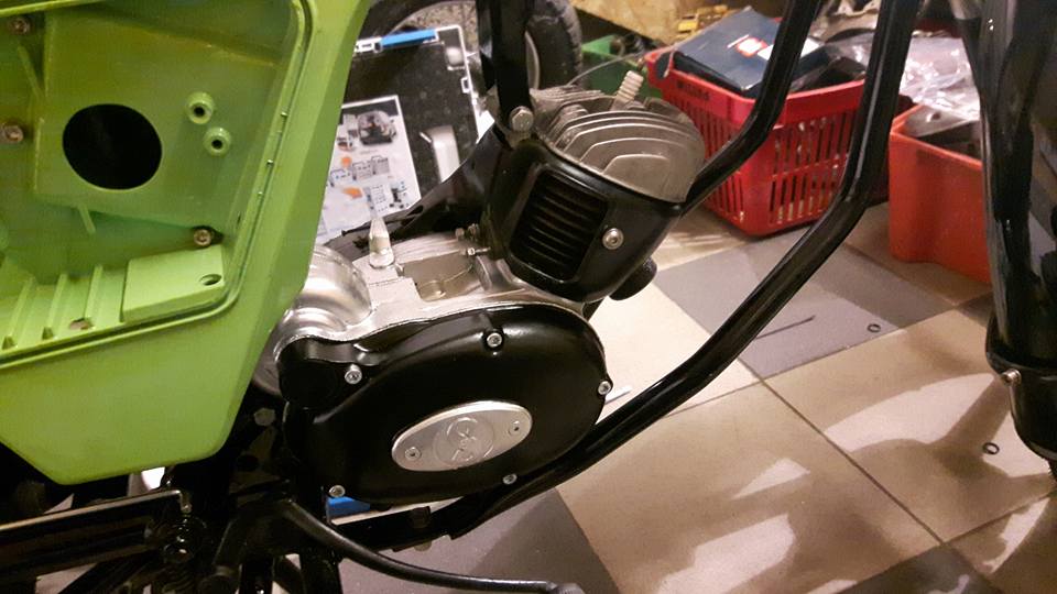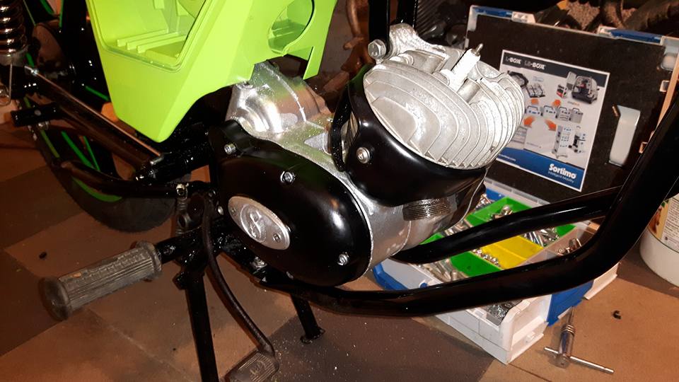 Ändå på mopedfronten fått gjort lite framsteg en självklar mindre modifiering och det numer obligatorisk bakslaget... Kan säga till dig gud var denna lilla detalj allt du hade så var det en baggis eller kanske bara extra snäll efter en tuffare än vanligt dag?? Började med fixa till gårdagens bakslag. kåpan som utav någon lustig anledning hade färg spruckigt/rest sig?? Jaja i alla fall flyttat upp baklampan lite såg bild efter gårdagens och insåg den skulle upp ett snäpp för snyggare linjer!! Men även fått på motorn och ett par kåpor... Motorn blev precis som jag tänkt mig riktigt snyggt i halvmatt svart och silver kommer göra sig braigt i alla fall. i morgon dags ta tag i sidokåpors gängor misstänker det saknas distanser då man inte kan skruva åt kåpor utan deformera dem.. Men blir morgondagens jobb om denna trötta kropp orkar alltså...