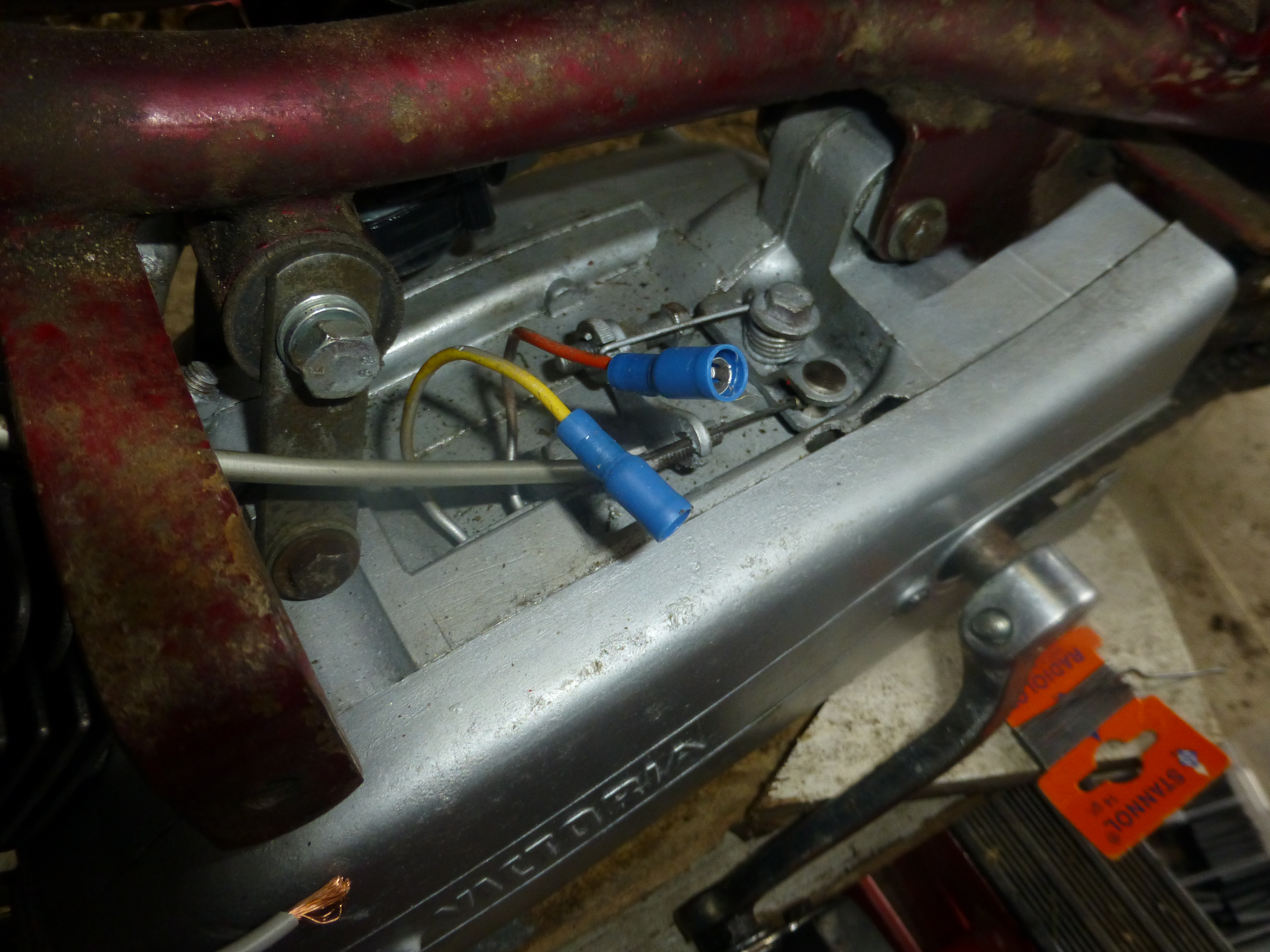 I väntan på ny kopplings vajer finns det annat att jobba med. Startade titta på el systemet, avklippta kablar och den gröngula är ju inte original. Lödade dit förlängningar och så krymp slang över.