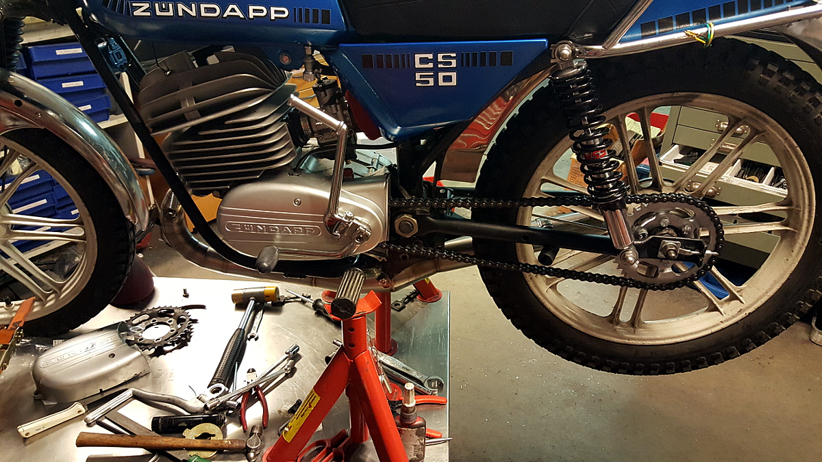 Kedja, drev och kickkåpa på plats. Det som återstår är att få hjulen lackade, montera centralstöd och fixa ett kedjeskydd.