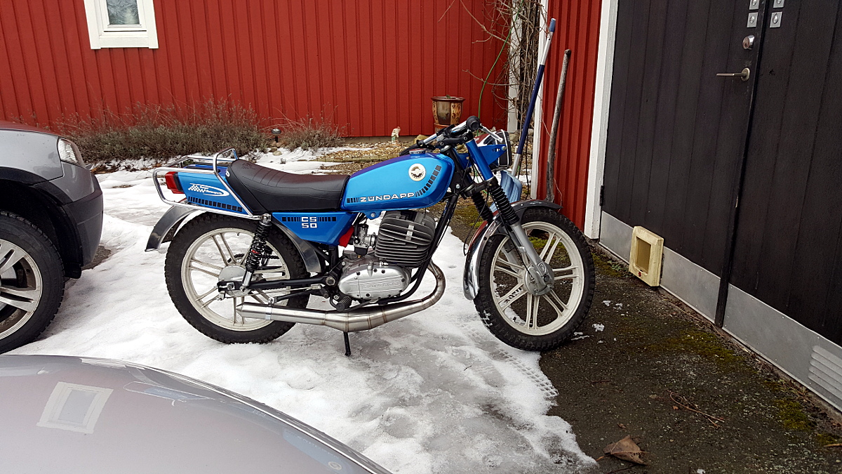 Nu är det i alla fall bara att hälla i soppa och trampa igång motorn. Det saknas bara lite småsaker som kedja, bakdrev och bromsstag. Samt ett nytt baklyse i.s.f. det som har en liten spricka. Enda skadan efter att troligen ha blivit rammad av en timmerbil