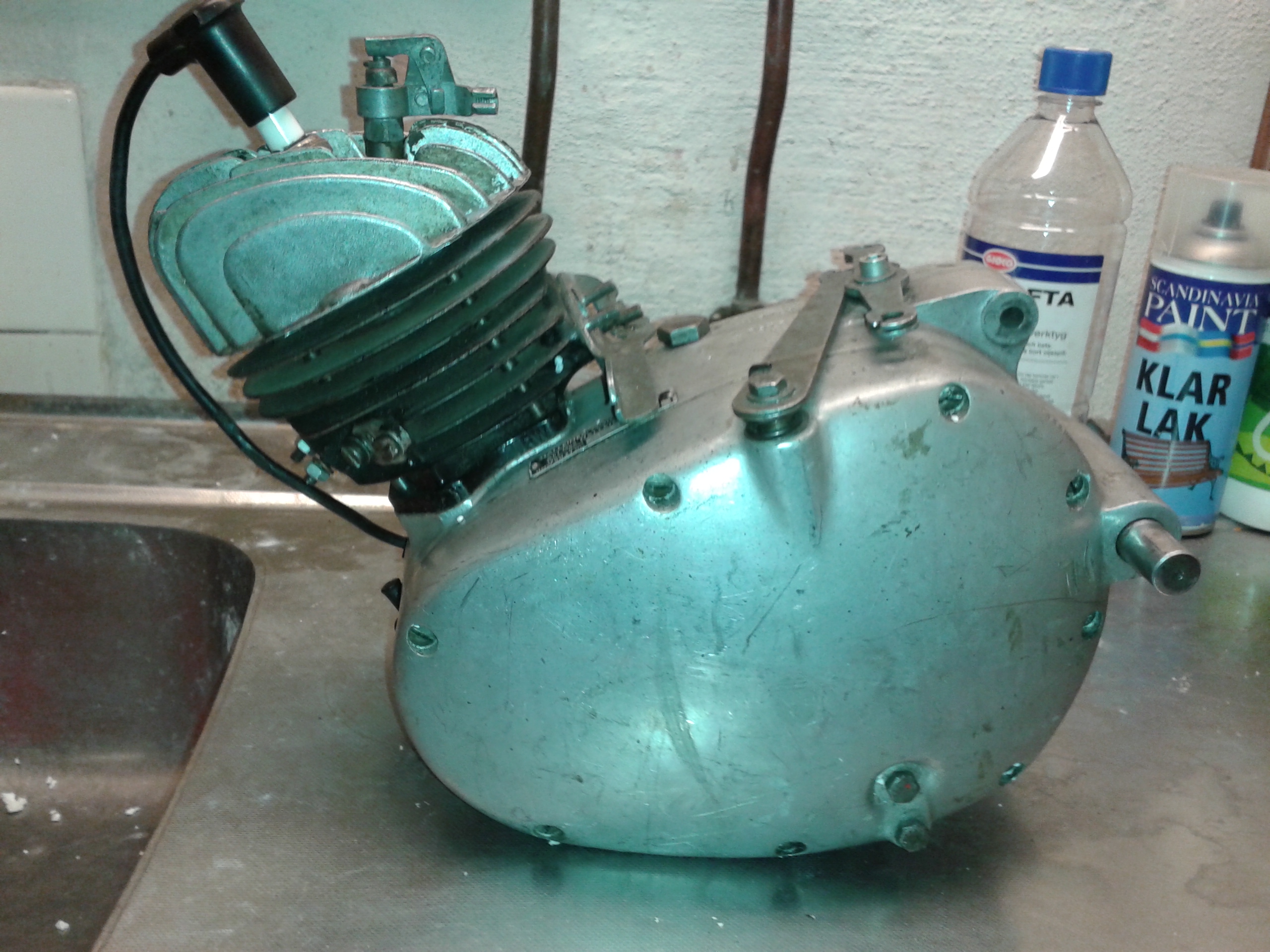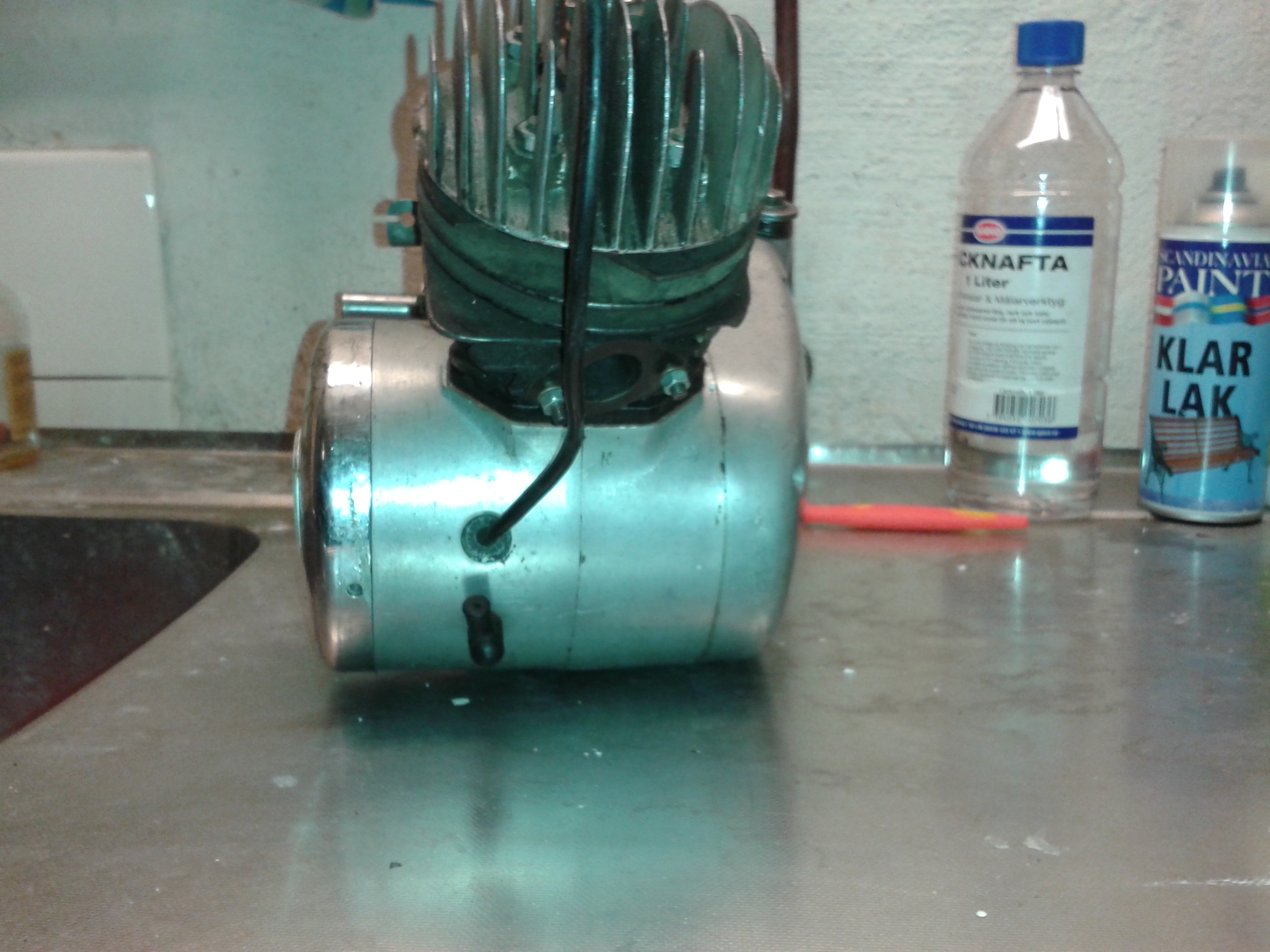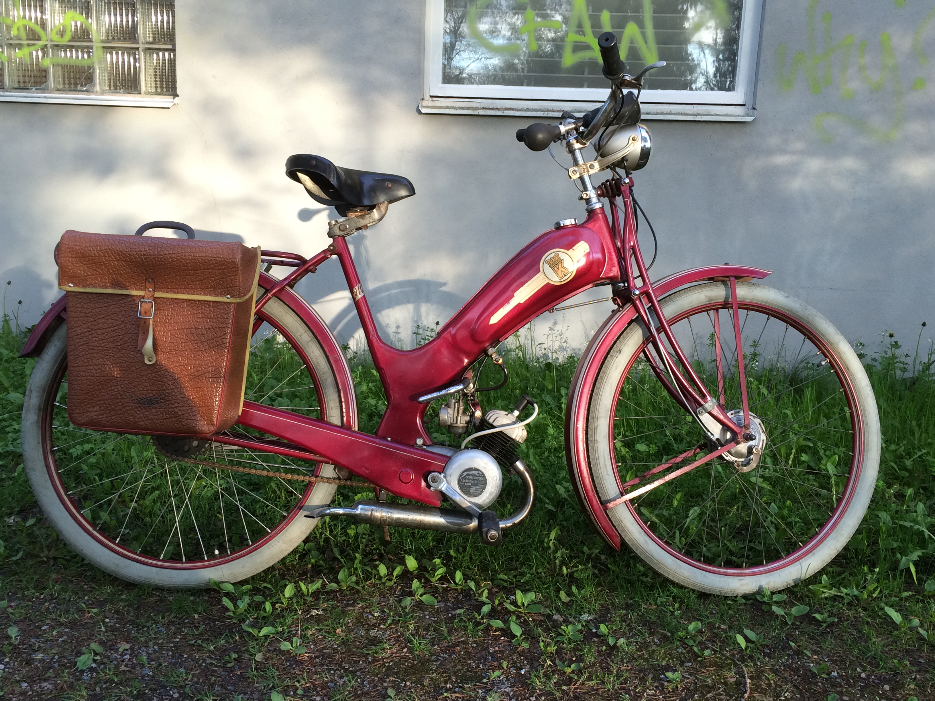 I våras köpte jag denna mopeden, en Kärnan med Expressmotor från 1954, köpt via tradera utan någon som helst funktionsgaranti, körde långt iväg och hämtade hem den, kom hem sent på kvällen och bestämde mig för att jag ville se om det fanns liv i den, jodå, med lite ny bensin i tanken och ny luft i däcken så gick den igång nästan direkt! Helt otroligt! Nog den piggaste enpetaren jag nånsin kört, gör nog 45 och är stark som attan, den var lite skabbig och saknade lite smått och gott när jag köpte den men jag har kompletterat det efter hand, dock behöver motorn nu en renovering för den läcker olja och vevlagerna börjar bli slut i den.