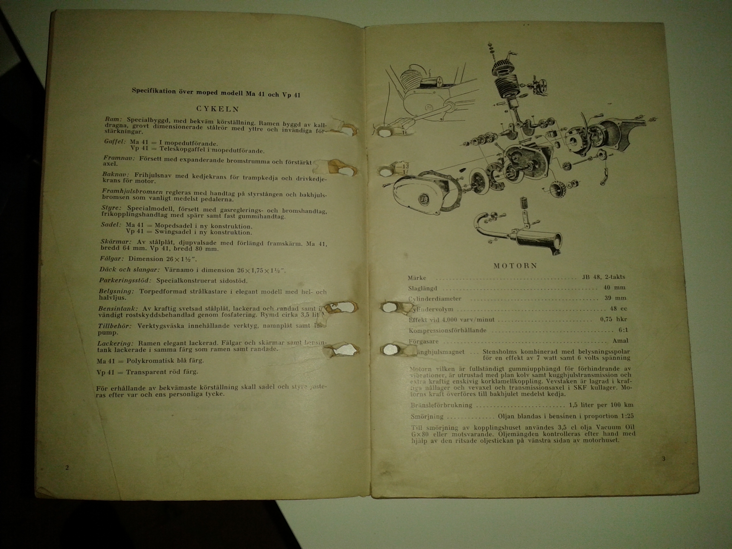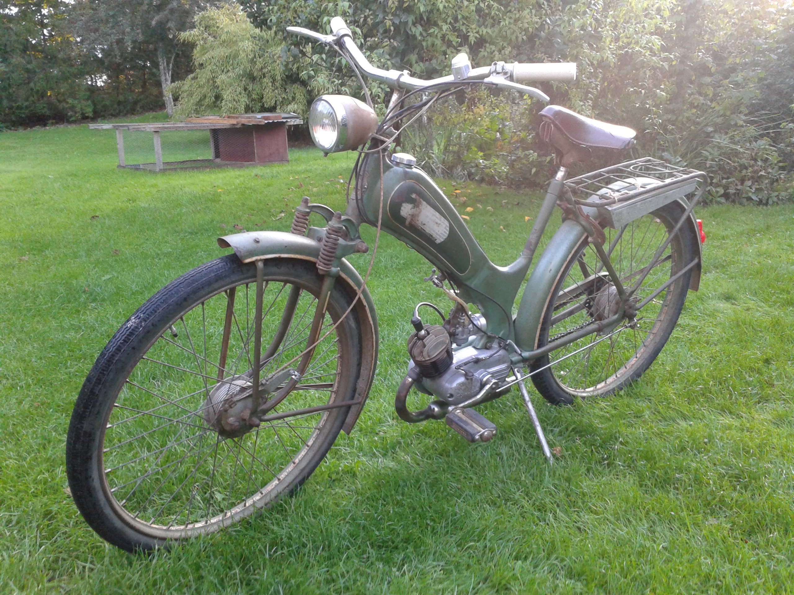 Sen blev det även en Victoria förra veckan, en Vicky 4 från 1956, har en del patina men är i hyfsat skick, motormässigt köpte jag den som ej fungerande, men efter att jag kom hem så konstaterade jag att förgasaren var lös och att det var veck på bensinslangen, så efter att ha åtgärdat det så startade den lätt! Dock har den lite problem, den ligger i ettans växel och vägrar gå ur den, så något är troligtvis trasigt i växellådan, får nog dela motorn. Dessutom är vajerfästena i bromssköldarna spräckta både fram och bak, så sånna söker jag efter med ljus och lykta...