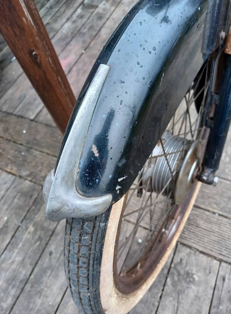 med kvitto på jobbet. Sen hade de samlats lite bättre krom som jag fick med vid köpet.. Sen följde de också med en rolig gammal broschyr o till och med saknad del av kedjeskydd vart hittad. Ägaren hade även en lika samma i topprenoverat skick... (ja även en topprenoverad "James Dean" Porsche och en löjligt fin bubbla)