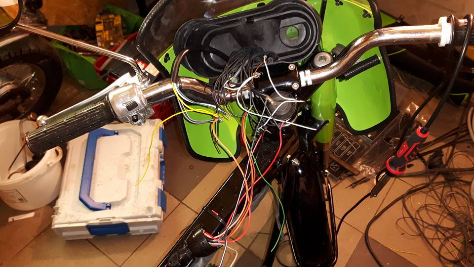 Ikväll gått i Elljusspår hela dagen knåpar elsystem börjar bli bra rätt nöjd över kabelstammen men många trådar blir de.. Vad kan man säga många kablar ändå saknas 5 från högra handtaget blinkers och bromsgivare. Men det handtaget kommer först på måndag!! Ja sen är inte signallampor och hastighetsmätarbelysning på plats men kablar sitter där.. Denna sida får batteri samt blinkersrelä. Andra sidan har gott om plats till regulator tändspole. Utöver har jag fixat tidigare fadäser fått en ny omgång blinkers.. Denna gång vart det med vit blinkers, klickade nog fel eller om det var felleverans? Spelar ingen större roll. Men fick ett dilemma vet nu inte vad jag tyckte var snyggast. Får nog prova hur de vita gör sig på och tillsammans med baklampan innan jag bestämmer hur och vilka. Fast ett byte skulle inkludera byte även främre. Går inte ha vita bak och orange fram skulle störa rejält.. Oavsett har de nya fått sig en omgång grund och topp monteras i morgon.. Utöver det har panelen fixas från gårdagens slipmiss.. nu bara lite torktid ifrån få tillbaka signallampor och hastighetsmätare... Men nu blir det sen mat och en öl sedan sängen i morgon ny dag med fortsättning....