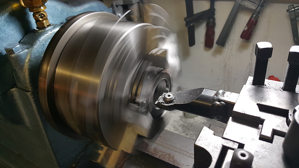 Så istället kapade jag bort så mycket som möjligt med en 3-fas Kina plasmaskärare som fungerar finemang. Sedan var det bara ett par millimeter att finsvarva. Till det använde jag en SECO Duratomic platta som verkar tåla hur mycket stryk som helst utan att slås sönder innan ojämheter är borta (s.k. interrupted turning) eller bli överhettat. När stålet ansätts ser det ut som en vackert stjärnfall med en glödande sol i mitten så det gäller att hålla undan brännbart inkl. eventuella oljiga spånor :D Stålhållaren är ett hemmabygge som jag gjorde av delar till en ändå större och modern svarv och är mycket stabil. Tack till Braxmatte !