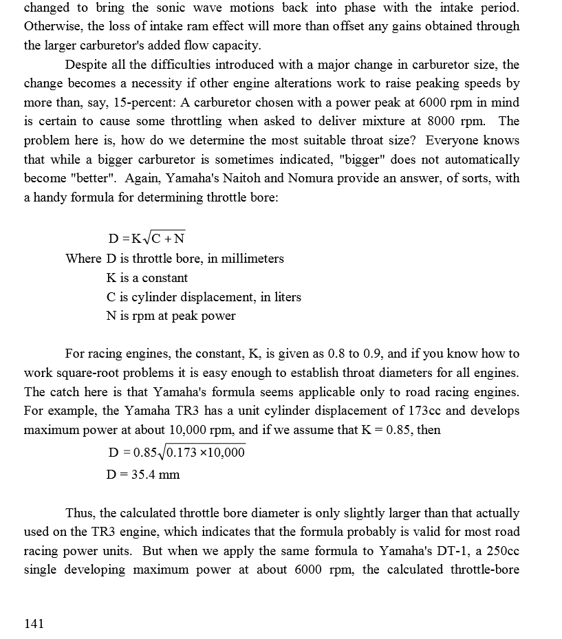 Jag har fortsatt att fundera på lämplig förgasarstorlek. I bilden nedan finns en beräkningsmall från Gordon Jennings bok Two Stroke Tuning. Det är egentligen Yamahafolks rekommendation för beräkning av förgasarstorlek till 2T. KS125 ger max effekt redan vid 7600 rpm. Efter trimning flyttas det värdet upp en del utan att nu veta hur mycket för höjningen av avgasporten blir väldigt liten om ens någon alls. Men porten breddas så den effektiva port tid/arean ökar och därmed även varvtalet för max effekt. Annat som spelar in är hur avgassystemet är avstämt och hur tändningen arbetar. Andra källor som t.ex. Graham Bell uppger för 125 CC - 30 mm för Enduro och 36 mm för Roadracing. Så det skulle kanske tala för 30 mm. Jag tor inte att det är så felaktigt att titta på vad de där gubbarna rekommenderade för länge sedan för en KS125 är från den epoken. Sådant här skulle man känna till om man hade en egen bänk men så långt tänker jag inte gå och det är säkert grannar glada för... Man tävlar trots allt inte i 2T racing, annat än varje gång flera kör samtidigt :oops: