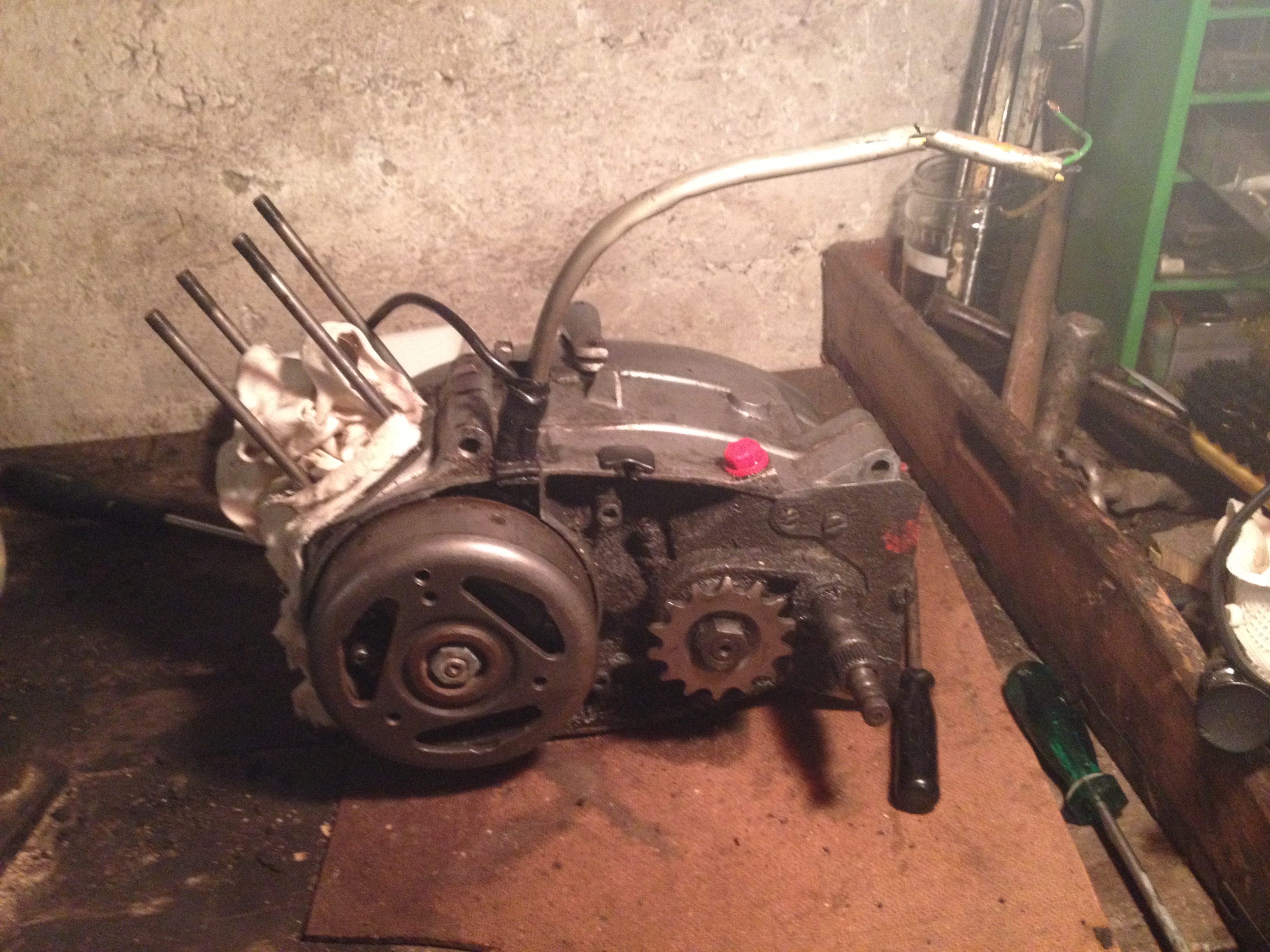 Fick klyva motorn några gånger till, första var för att jag inte använde något packningsklister, men lika bra var det för jag hade fått tag på fel sorts packning, for in till stan och skaffade några packningar och en burk packningscement, när jag äntligen fått dit klistret och packningen så funkade det ändå inte som det skulle (Det gick trögt att snurra på svänghjulet och alla växlar gick inte i som dom skulle). Fick klyva igen.... efter många försök med att genomskåda va som kunde hindra att växlarna gick i så fann jag problemet tillslut! Växelklockan! den var fel inställd! Fixerade klockan och klämde ihop blockhalvorna och testade, alla växlar gick i!