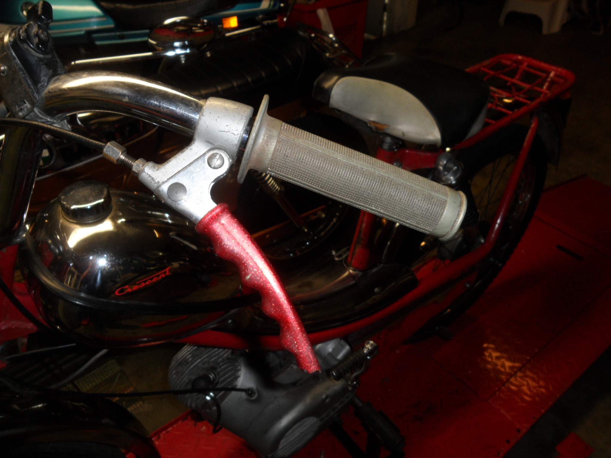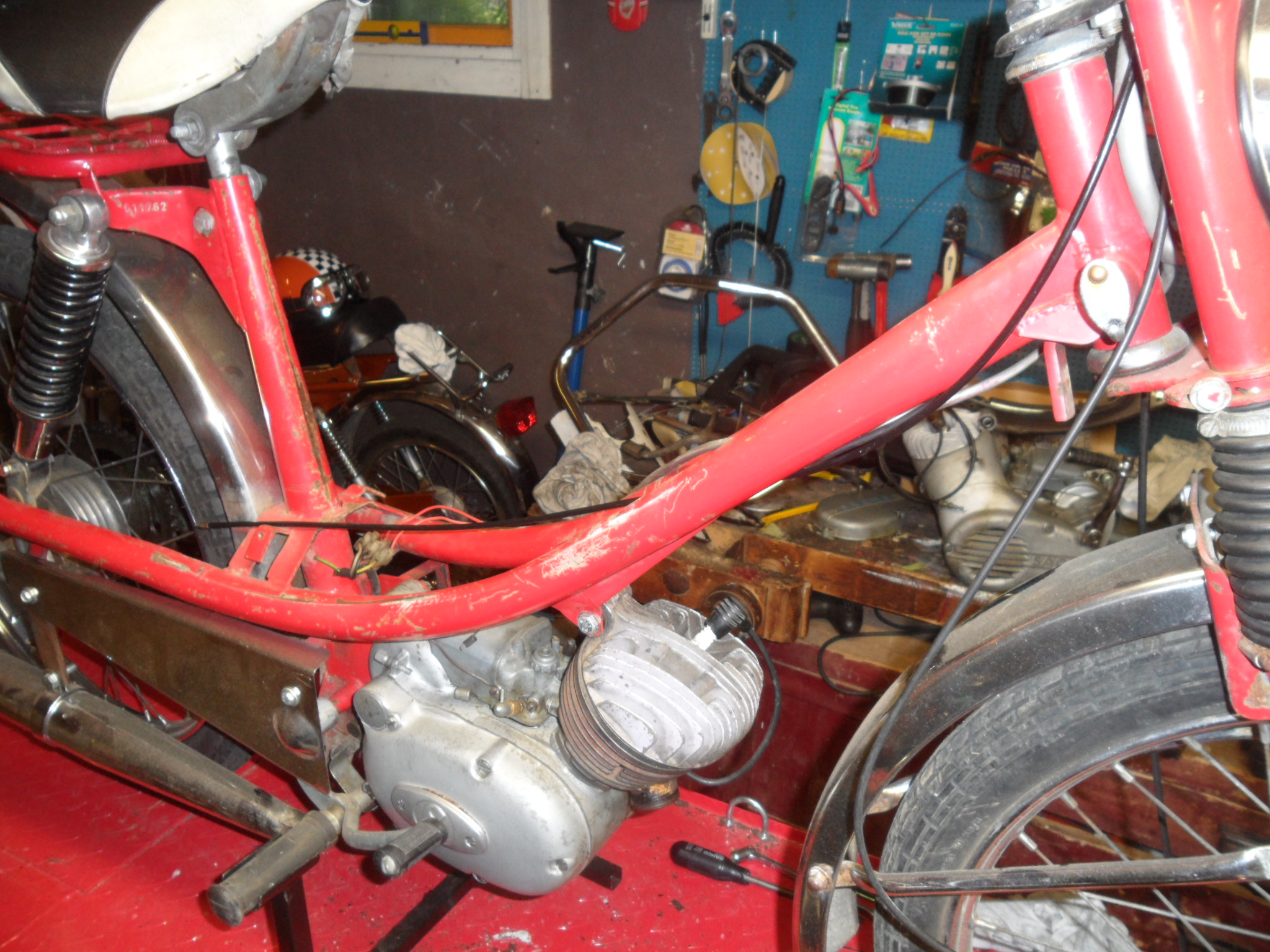 var nere å pillrade med skråpet lite på förmiddagen...tog en annan gasare jag hade liggandes å se vips gick det lite bättre nu ser det ju rätt ok ut..skruvade ihop en del annat oxå bytte ut växelhantaget mot ett kopplingshantag..men saknas fortfarande lite småprylar..skruvnipplar till handbroms finns ju förstås inte hemma...och en växelpedal behövs oxå...få se när jag hinner fixa det, är ju en massa annat pyssel än mopeder här hemma oxå..