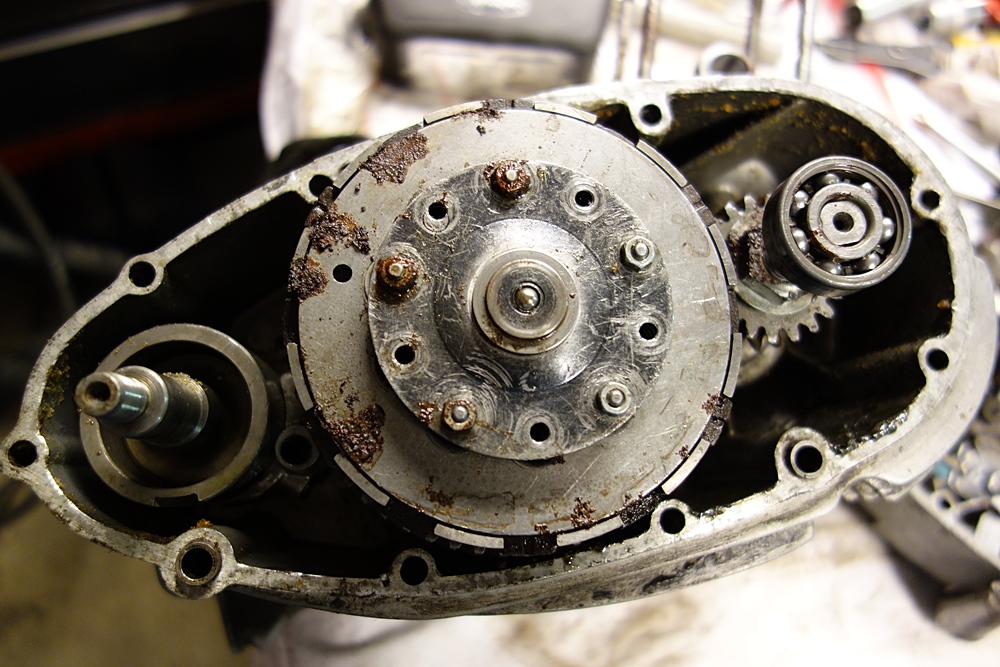 Sissådärja, då har motorn kommit och fått en första besiktning. De goda nyheterna är att det ser bra ut överlag (om man har sett gamla sunkiga motor förut). Det är bara en normal renovering som behövs och t.ex. växelklockan och kopplingen ser bättre ut än på 5vx KS50 motorer som jag har gjort iordning.