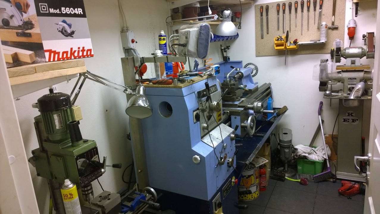 Maskinparken är ganska god. Se foto. Har en Storebro 195 och en metallfräs, svets mm.