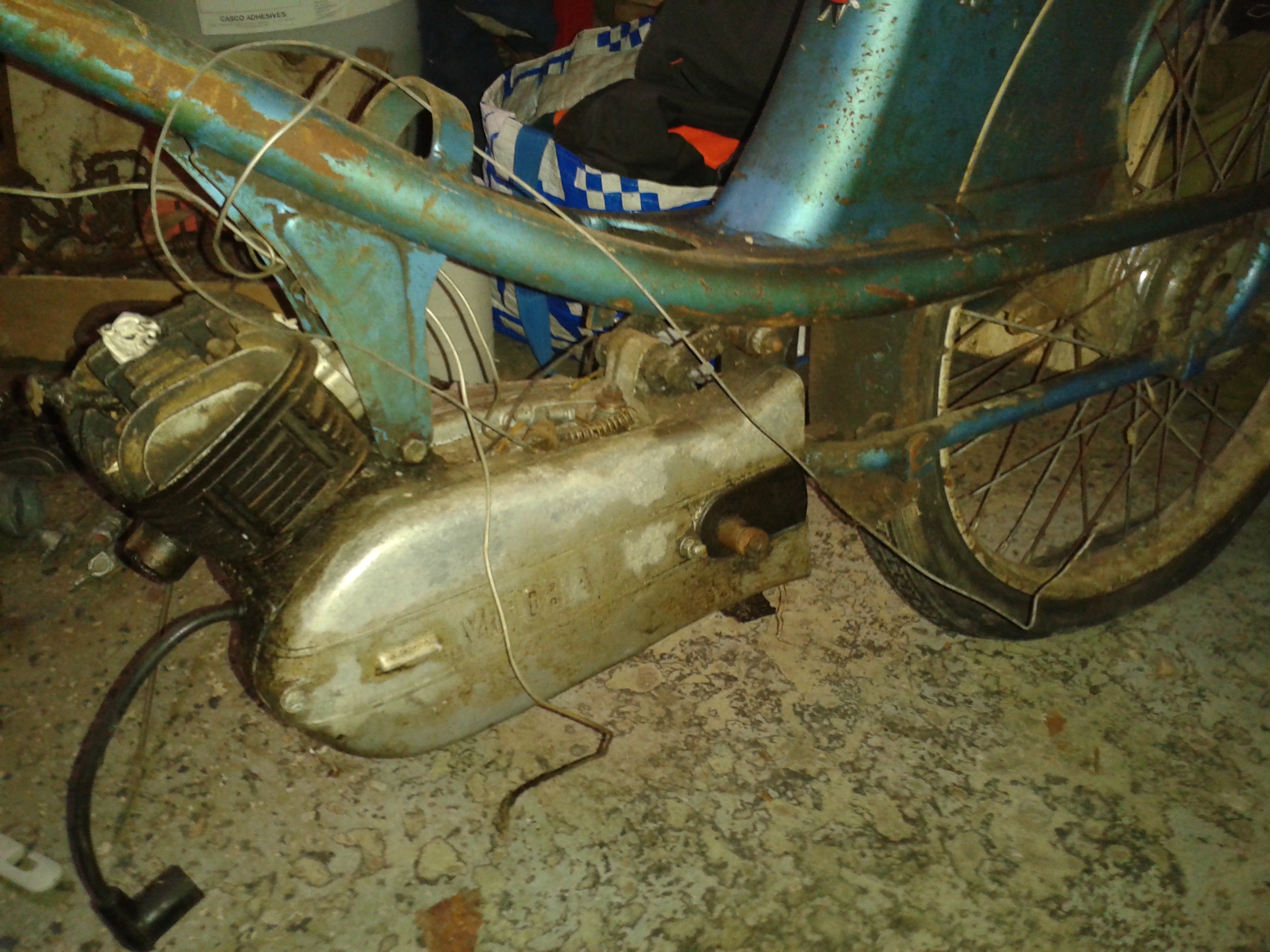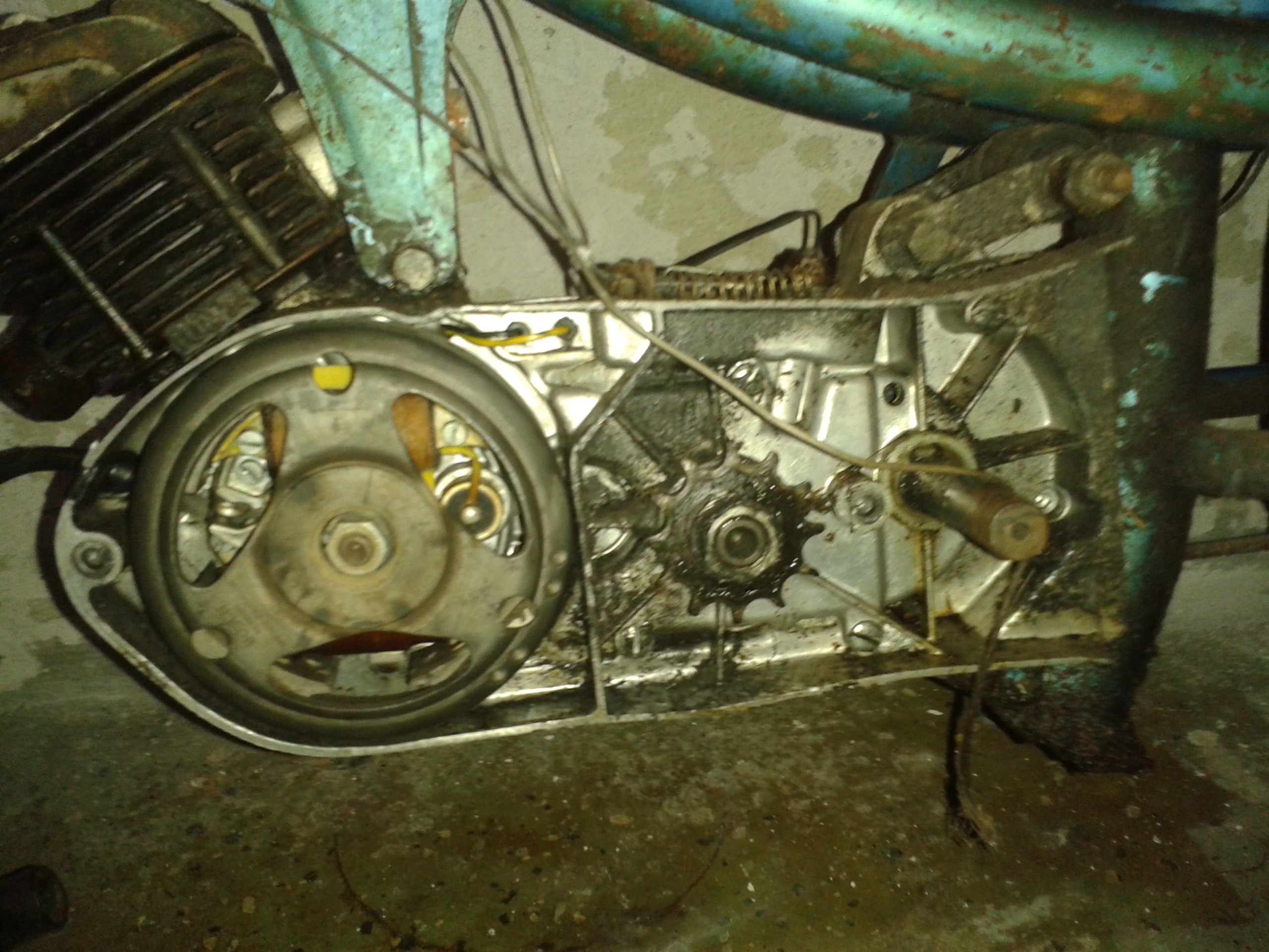 Motorn såg inte bra ut, en gammal halvt oxiderad ms51:a som saknade både förgasare, luftburk, och tändstift, (allt detta hittade vi senare i halmen).