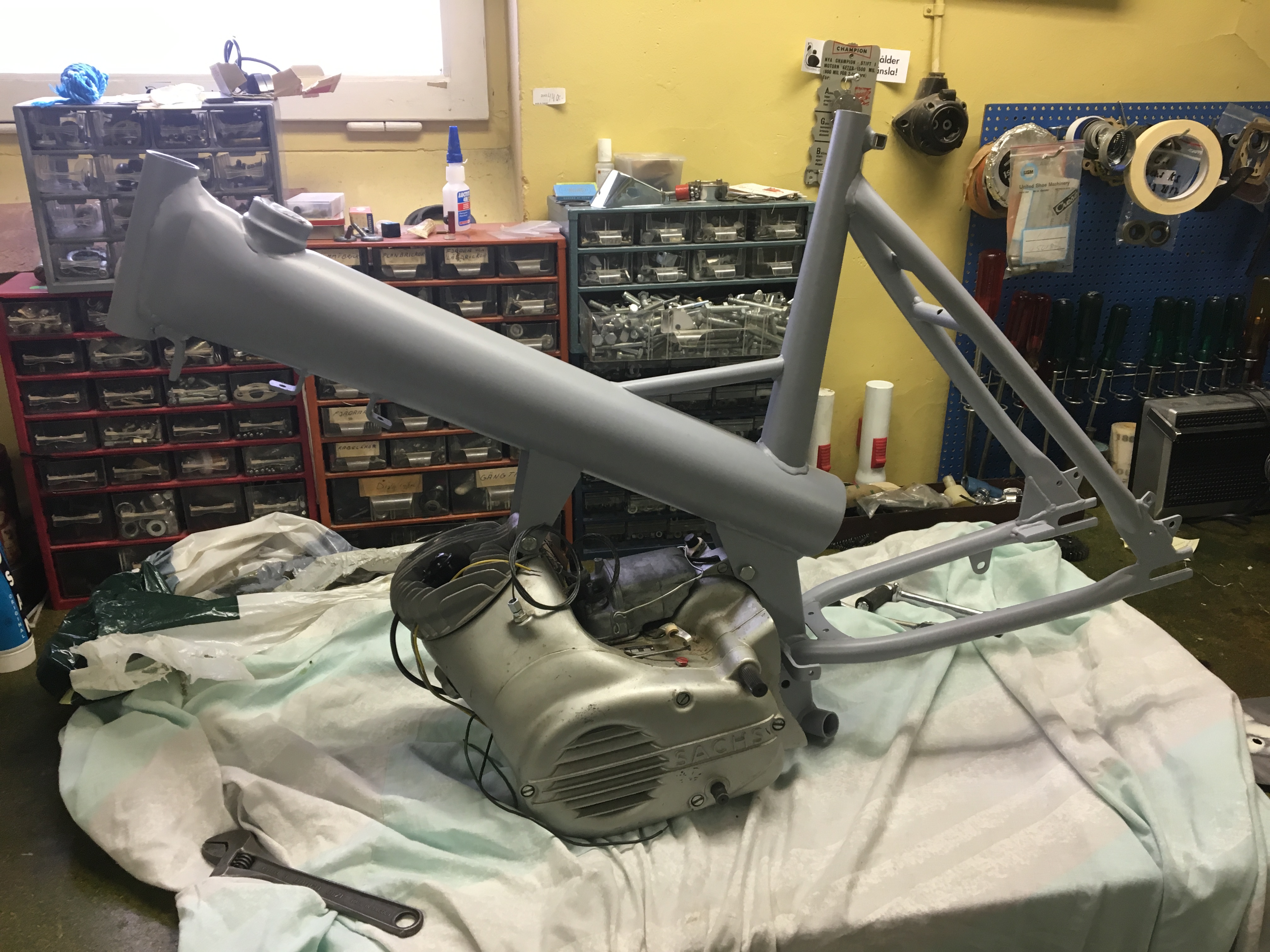Har kommit en bit med ramen och delarna. Allt är numera grundat och färdigt.. Hade en 3vxl fläktkyld NOS motor stående tillhands så va tvungen o testa så den passa i ramen och kedjelinjen funkar prima med orginal kedjeskydd på den bredare motorn, får flytta ut kedjeskyddet framtill bara.