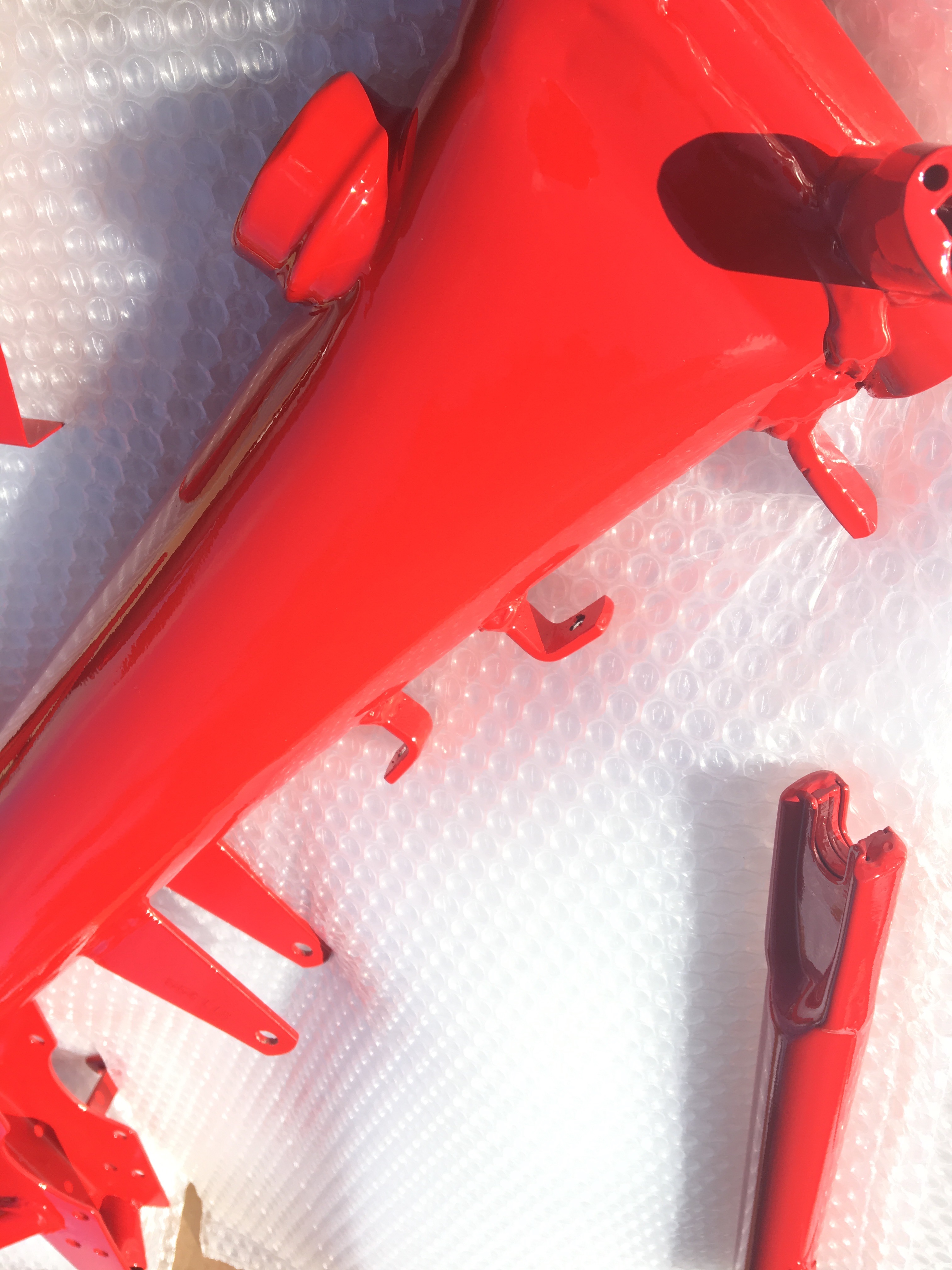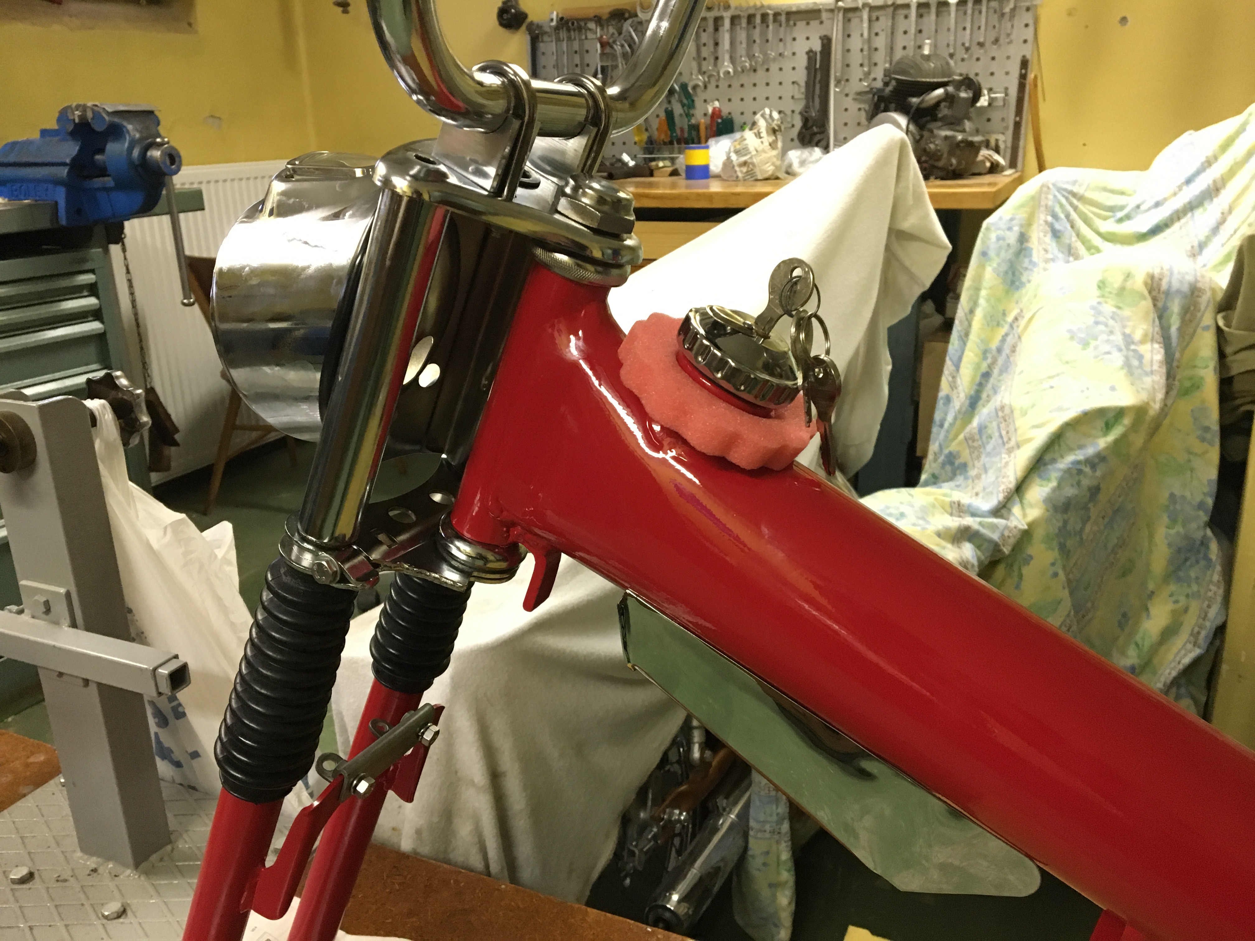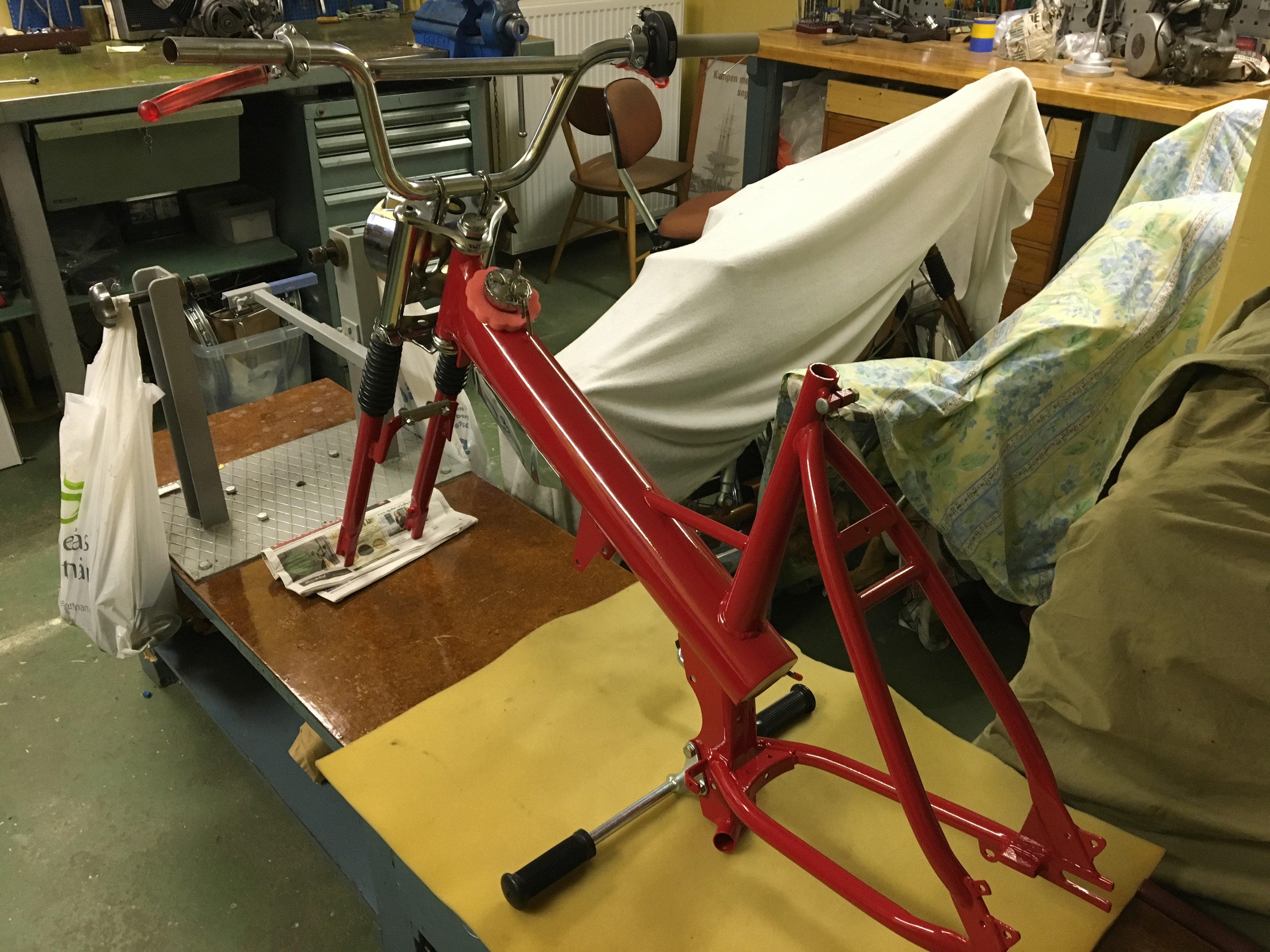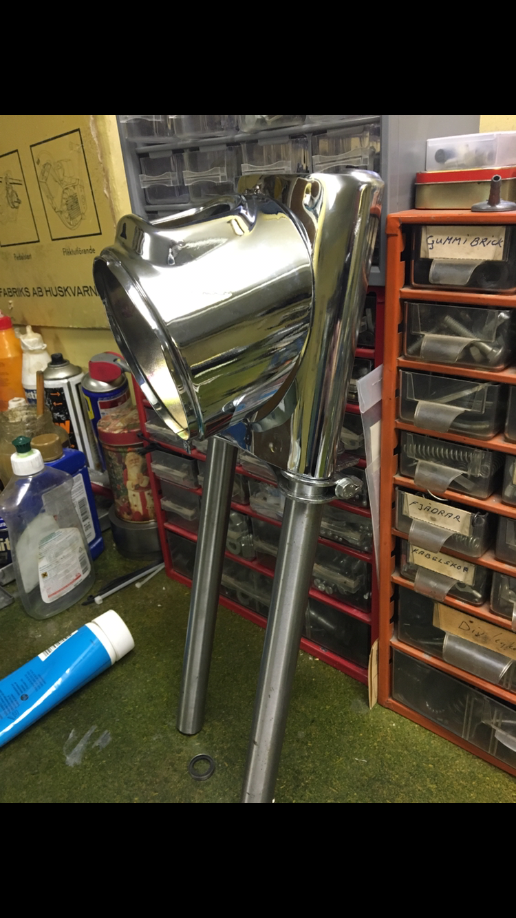 Ramen har stått länge så först fick det bli syra i tanken, även ytrost har smugit sig på men inget större.. Dessutom hade 1239an som producerades inget styrstopp? kabelsamlaren "Tutkåpan" fanns ingen heller då signalhornet sitter på framgaffeln.. prototypbilden hade dock det! Så därifrån har jag tagit idén till min. Dock ska jag använda mig av en Compact framgaffel så signalhornet behöver sitta som på prototypen. Så NOS styrstopp och fästena till kabelsamlaren fick komma till användning också.