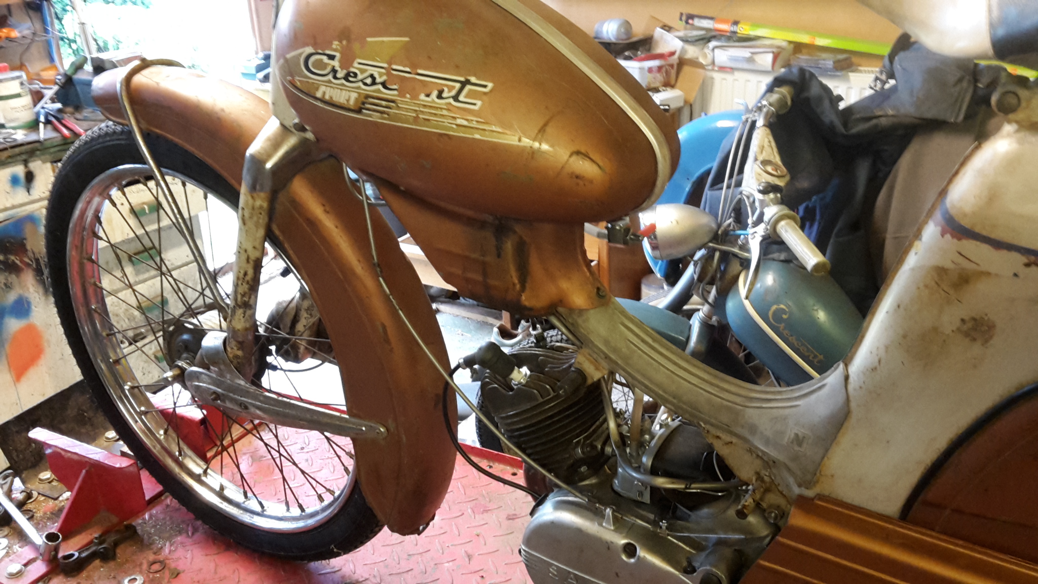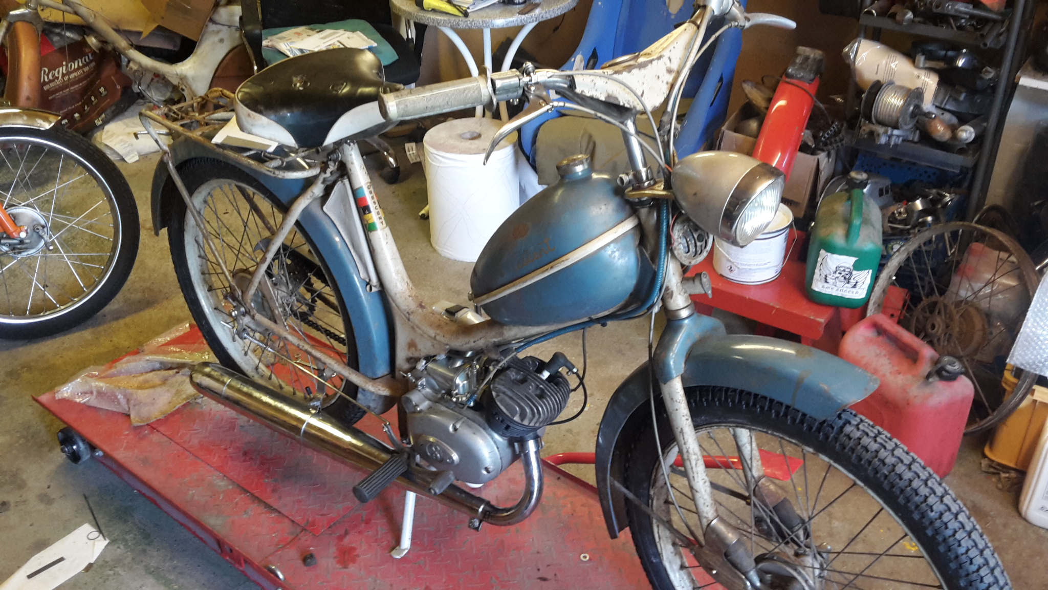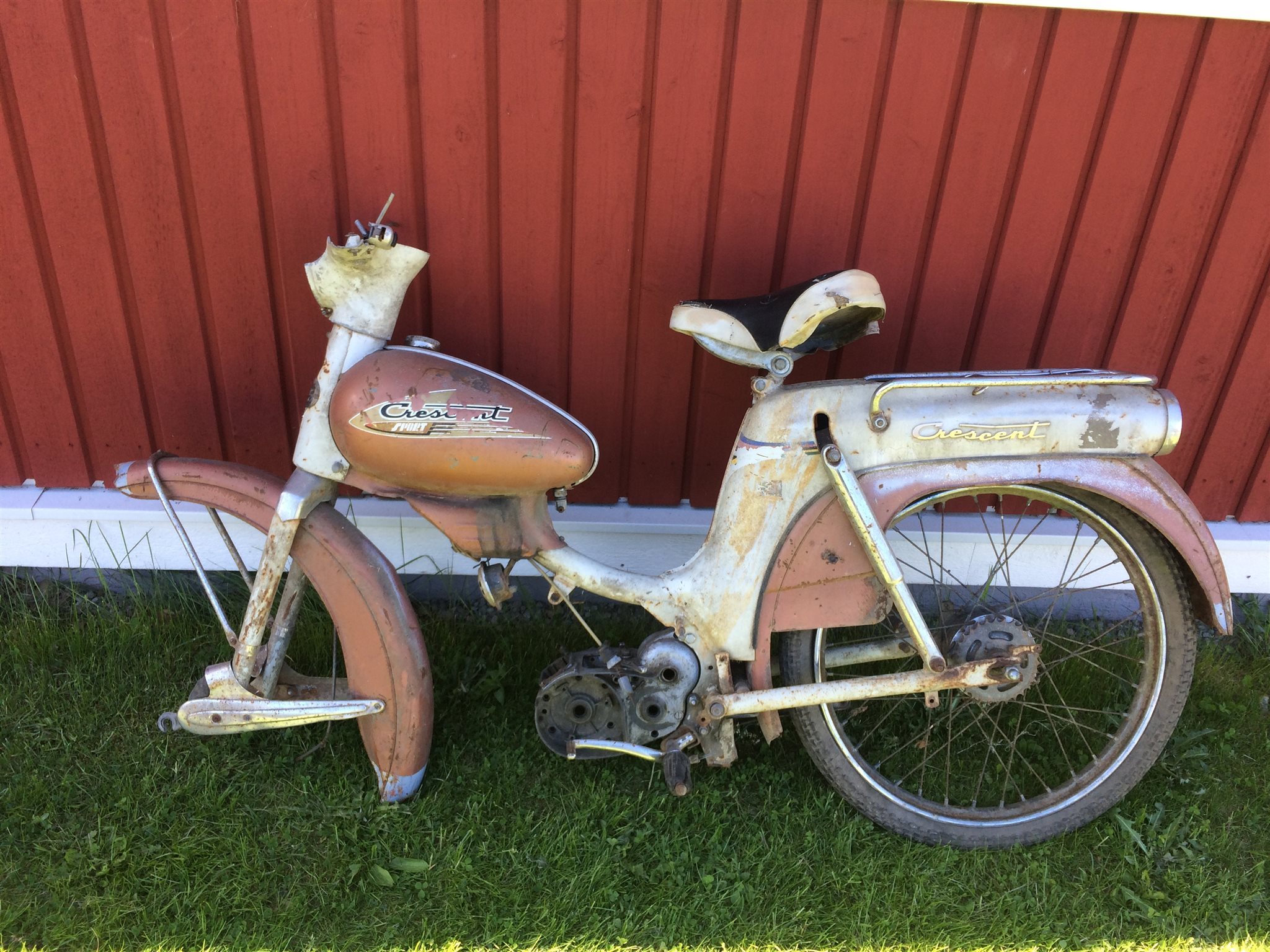 Jag slog till på ett par Nymans moppar för ett tag sedan. En 1134 -59a som jag köpte av Cobra Karlsson och den saknade kedjeskydd ,styre, och sadel. Och så köpte jag en 1151 -61a i grannkommunen som visa sig vara ett riktigt objekt men väl värd att leva vidare.1151an saknade mycket delar, men jag har lyckats få tag i det mesta till den.Jag tänkte bevara skicket på den som den är men svårast blir att patinera kedjeskydden och motorkåporna så dom passar in på moppen. Men nu i dag så är det premiär för 1134an, jag har dock uppgraderat den med fotpinnar och storcylle.