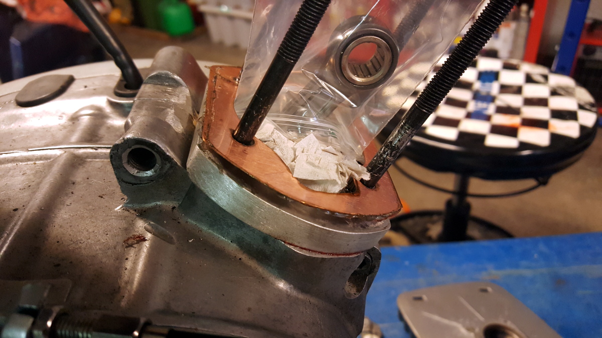 Nu har jag fått tillbaka cylinder och kolv som är modifierade för reedventil av Tivedens Motor och påbörjat montaget. Den tjocka spacern jag använder beror på att jag har en VRM-vev med 45 mm slag och 100 i.s.f. 91 mm lång vevstake.