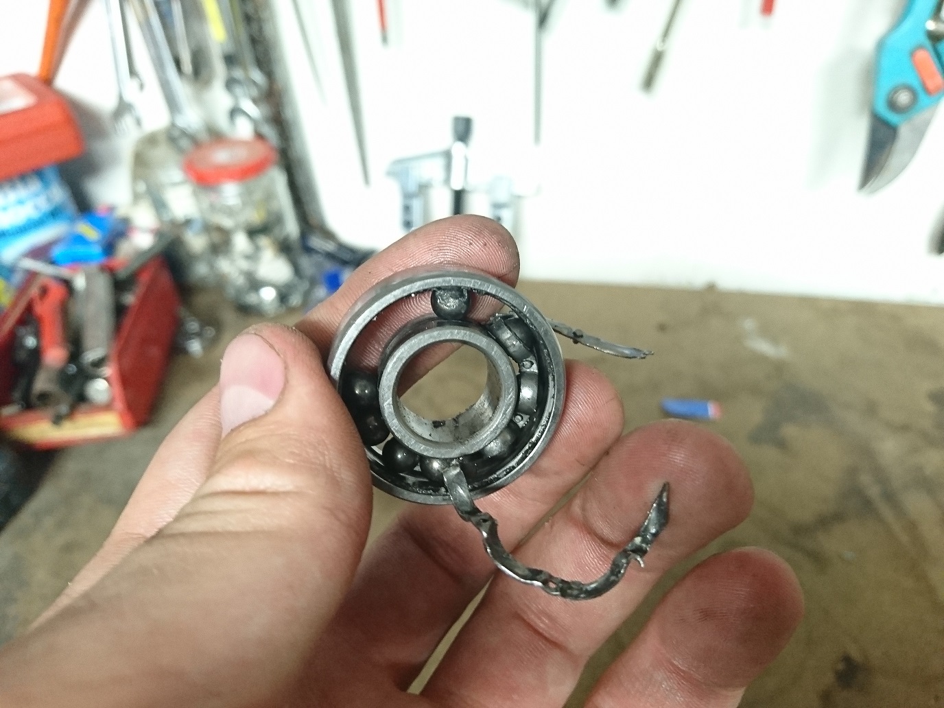 Man kunde se att ringarna som håller kulorna på plats hade delat sig, och flera av kulorna i det berörda lagret såg nästan ut att ha splittrats och saknade delar. Så jag rev isär allting i molekyler och blåste rent ordentligt för att slippa framtida problem.