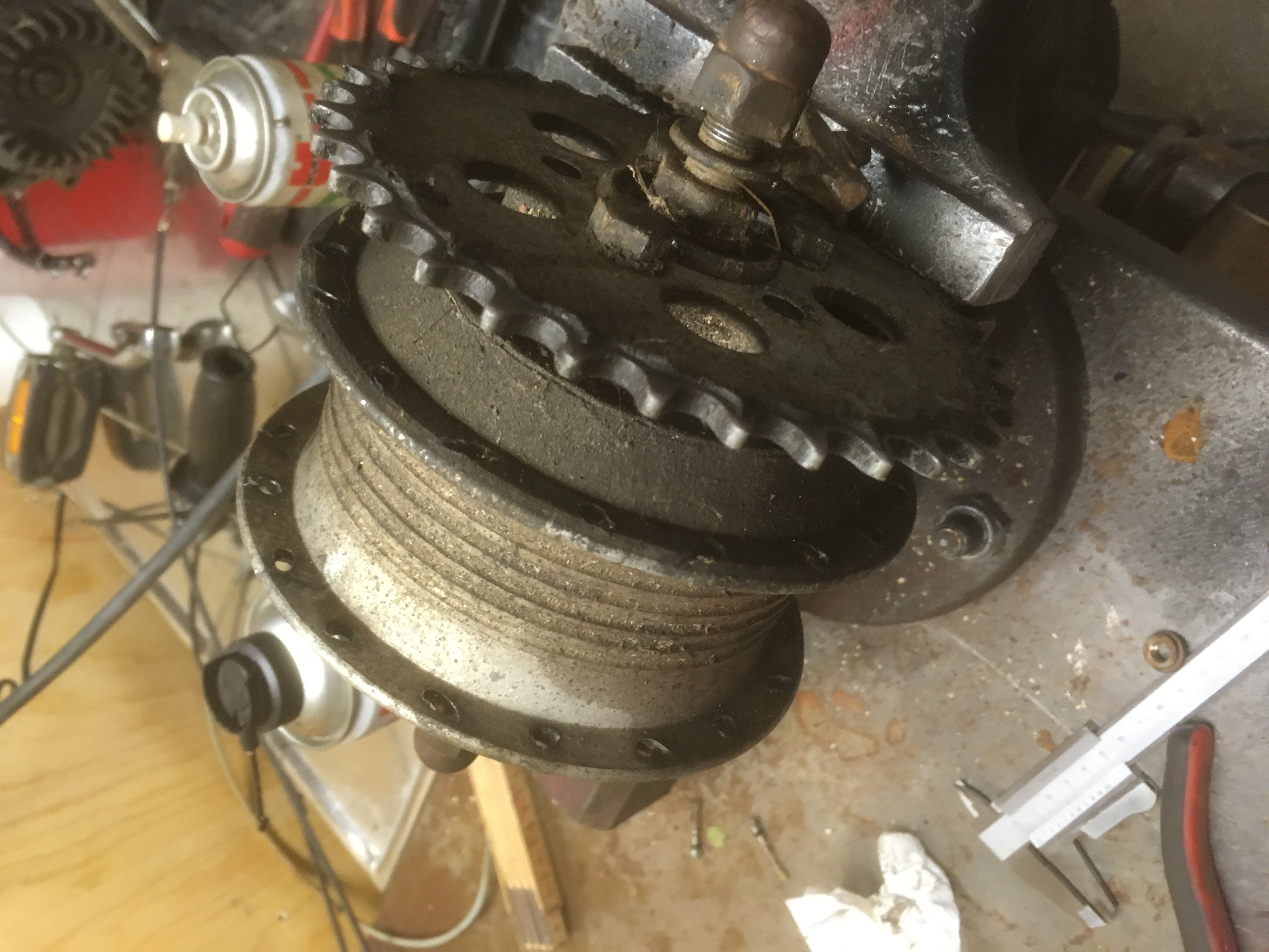Baknavet före och efter rengöring. Fälgen var riktigt dålig och det saknades många ekrar, men nya delar är beställda.