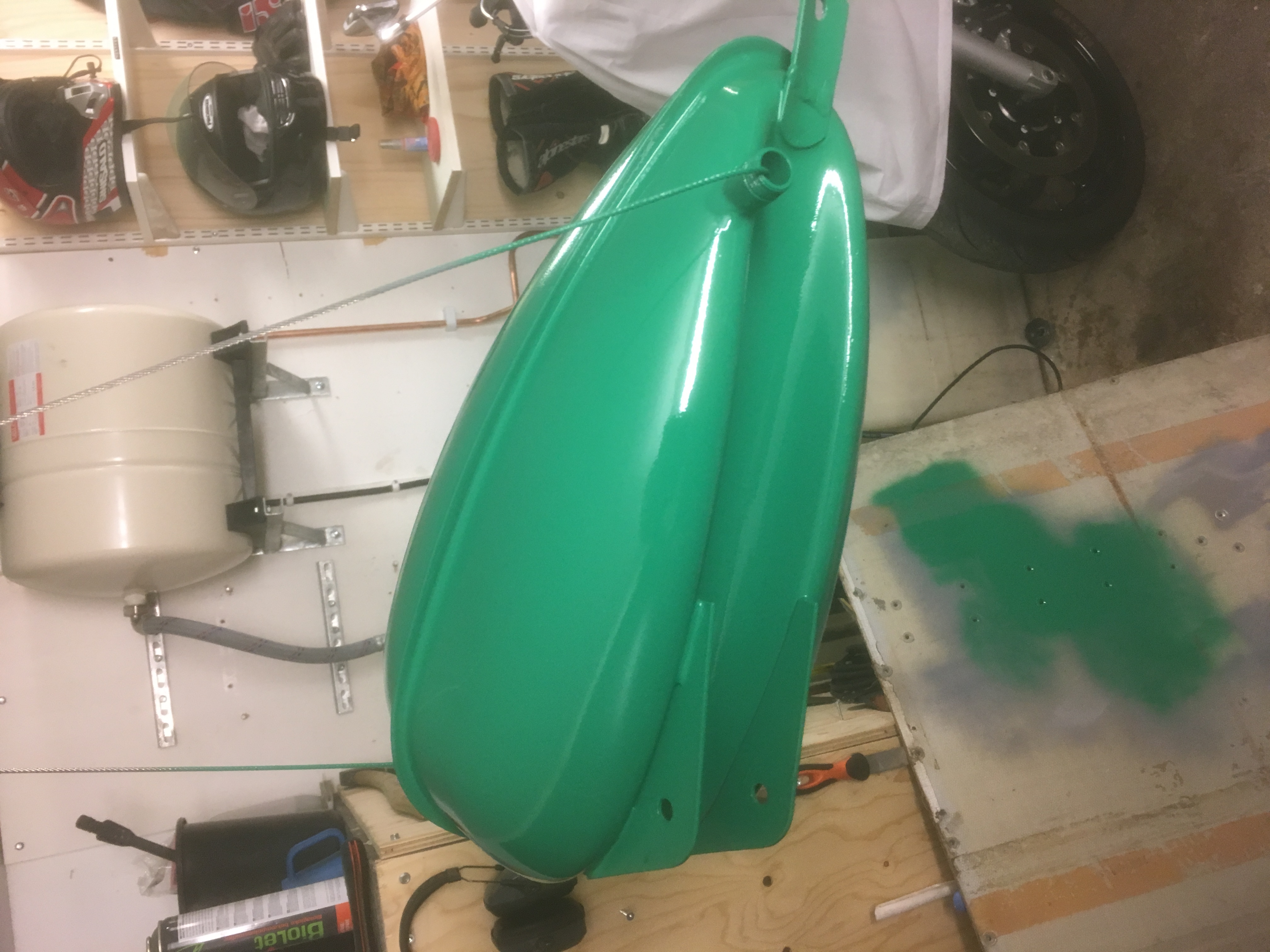 Killarna som blästrar och pulverlackar ramen ville inte lacka tanken pga att den kunde ta skada i ugnen. Så det blev till att lacka tanken själv. Grundad och redo för färg.