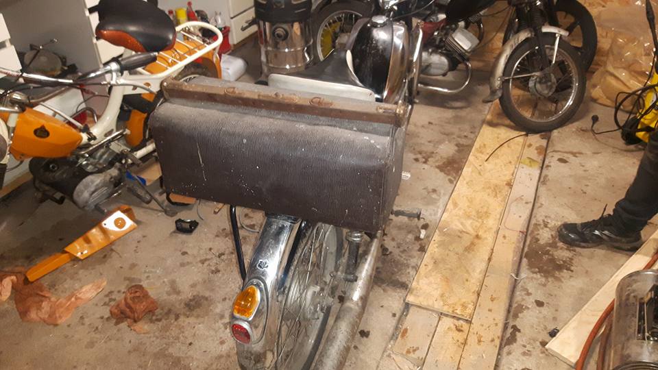 Sent hemkommen och insett att någon slang fick jag inte köpt. Så uppdaterade Hybriden med ett ladugårdsfynd en gammal doktorsväska till termos och lite utifall att.. Övrigt alltid trevligt med frambroms backspegel likaså. Speciellt med en toppfart på runt 50 å det räcker gott i kylan men kommer med all säkerhet bli omkörd av många varmblodigare eller galnare än mig. Lustigt nog fungerar 17mm ubåt helt ok trots otrimmad i övrigt. Hur det kan komma sig vet jag inte riktigt bara nöjd att det fungerar ny cylinder på väg i alla fall och även varmare väder hoppas jag. Likväl mopeder lastade i morgon blir det Chicken i alla fall..