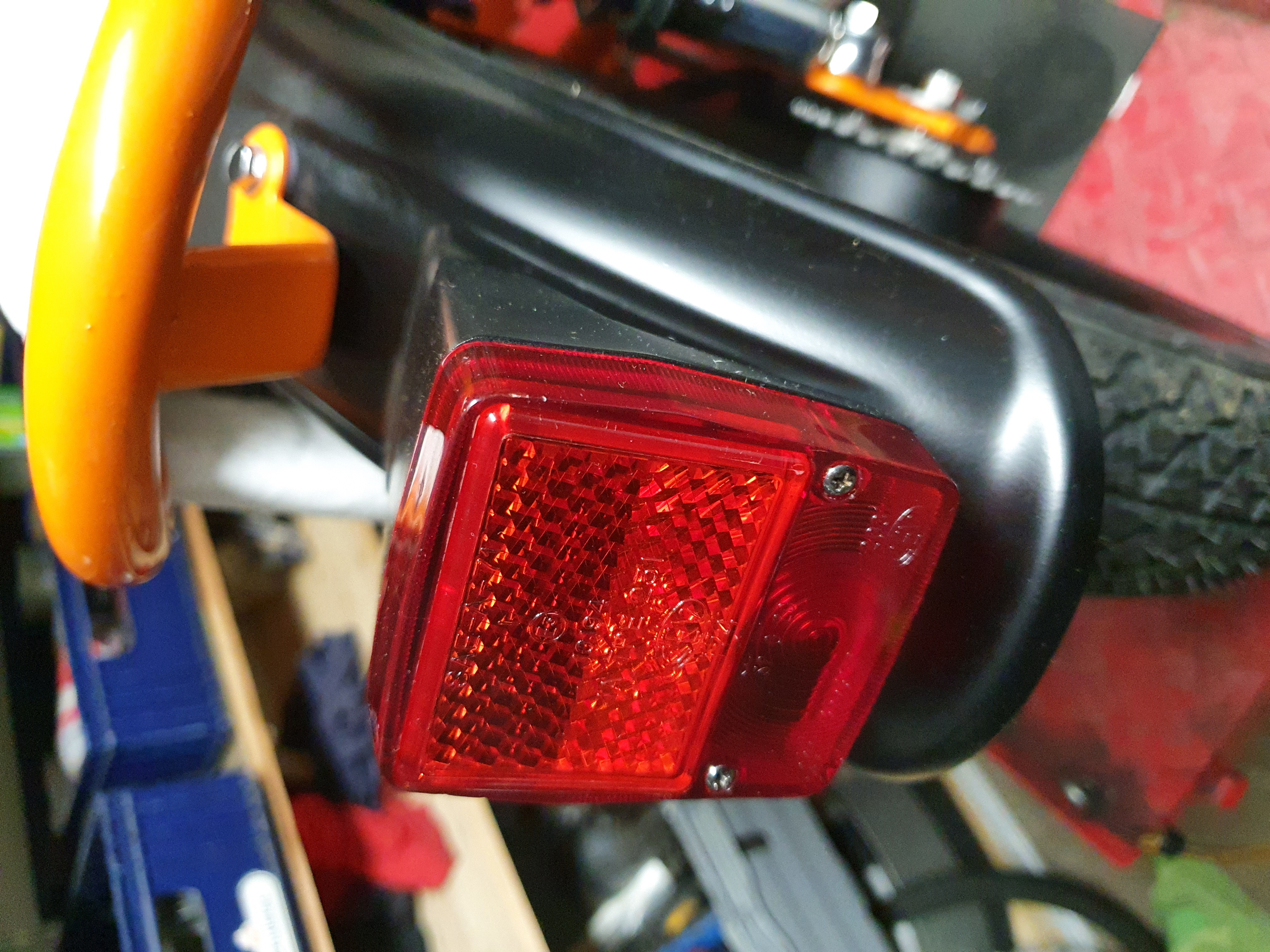 Biltema har spreylack både orange o röd för lampor och lyktor.