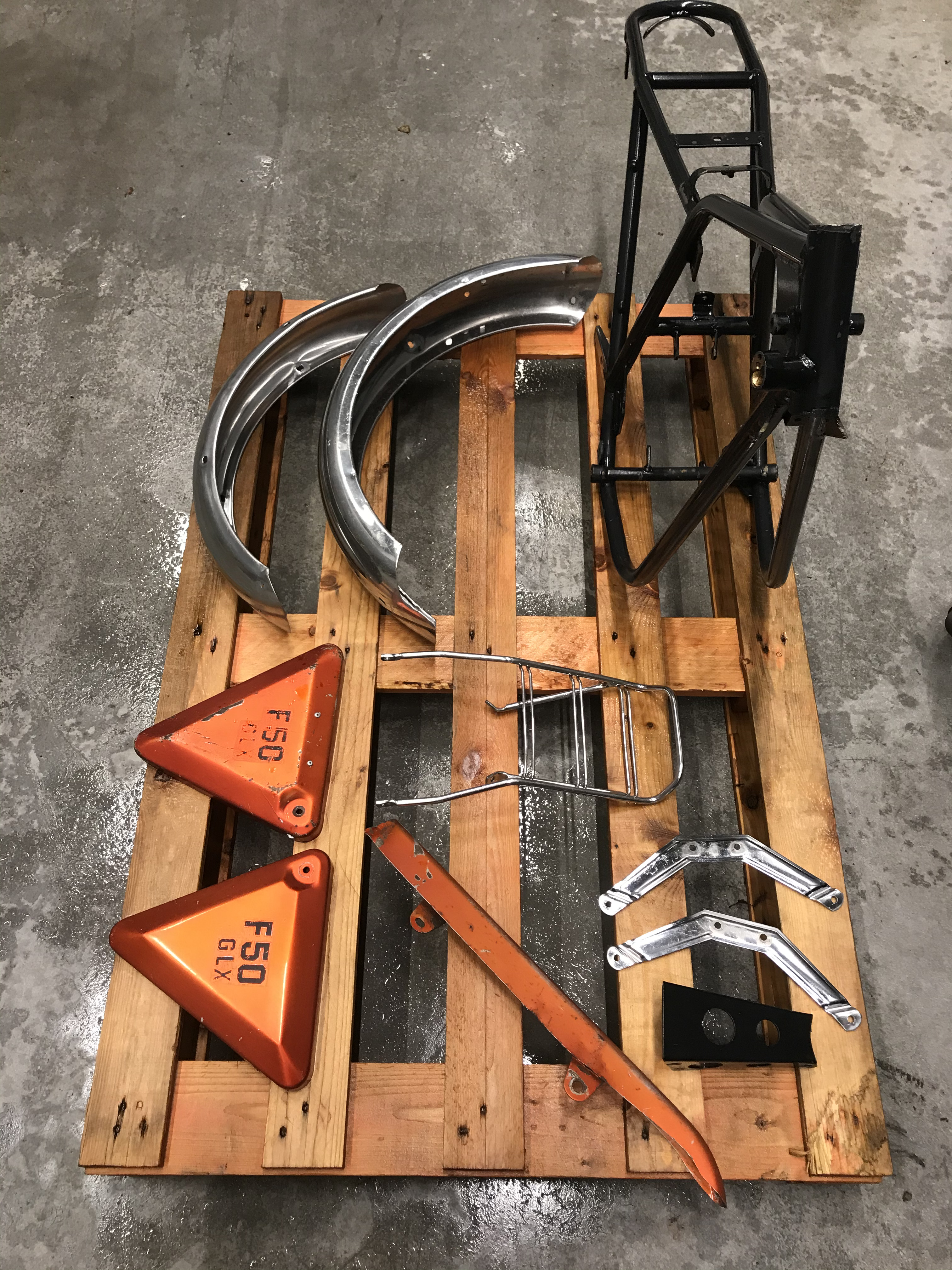 Sidecarrob har varit ihärdig med att återställa SM50 till originalskick och det har inspirerat mig. Sakteliga föll den tanken över på detta projektet med. Men att hitta Tank, kedjeskydd och lykthållare i patinerad kopparröd verkade svårt.