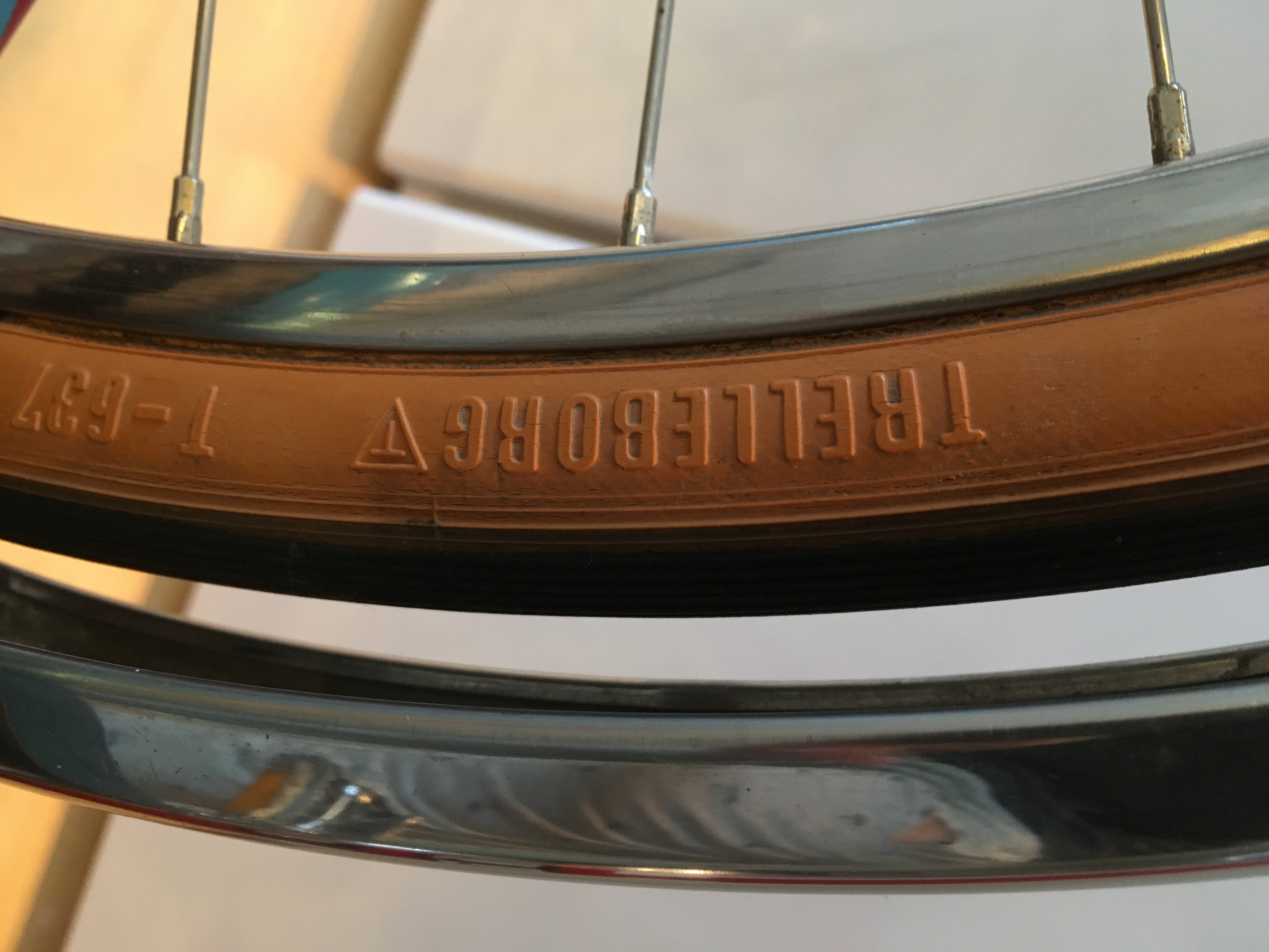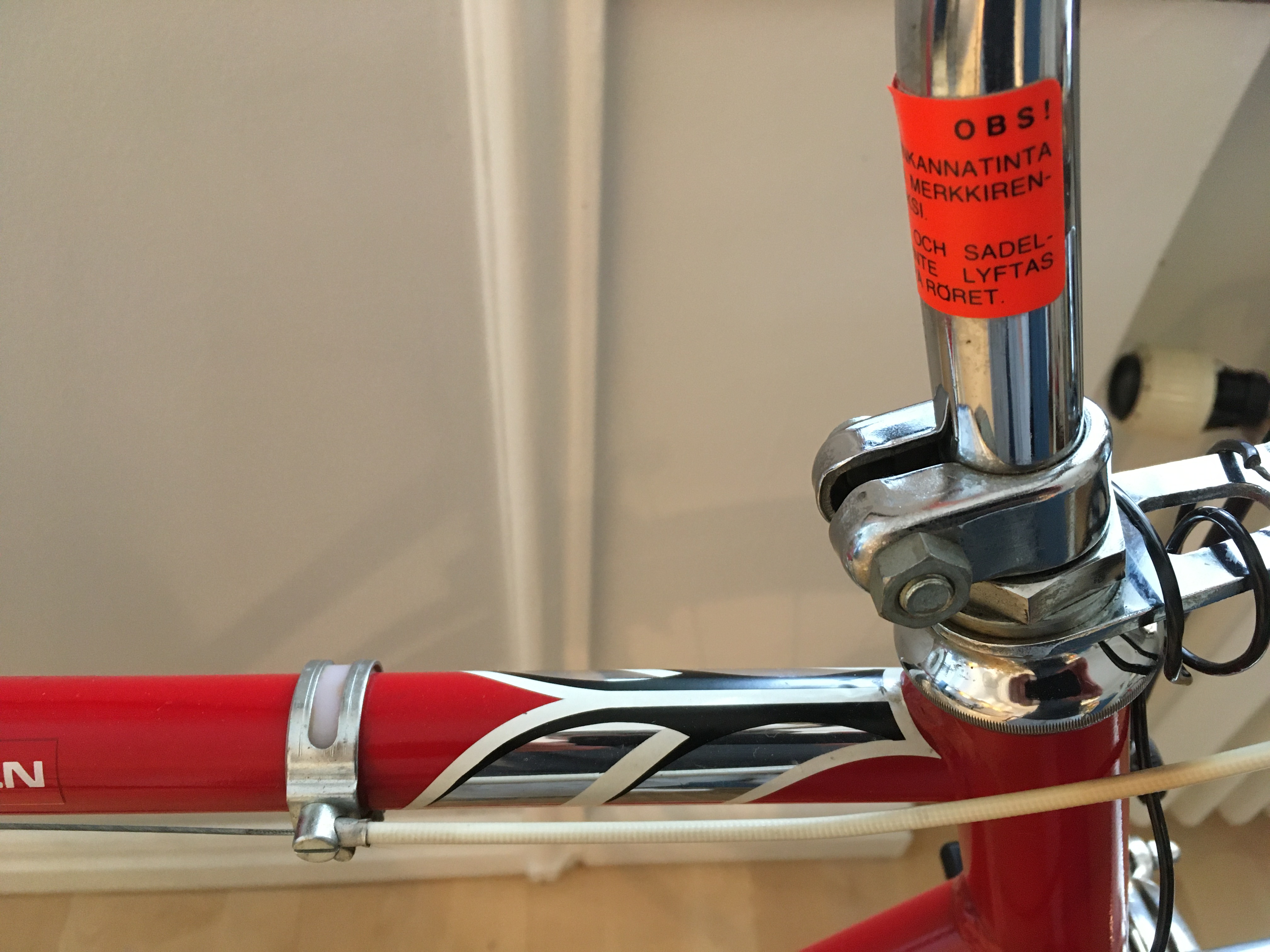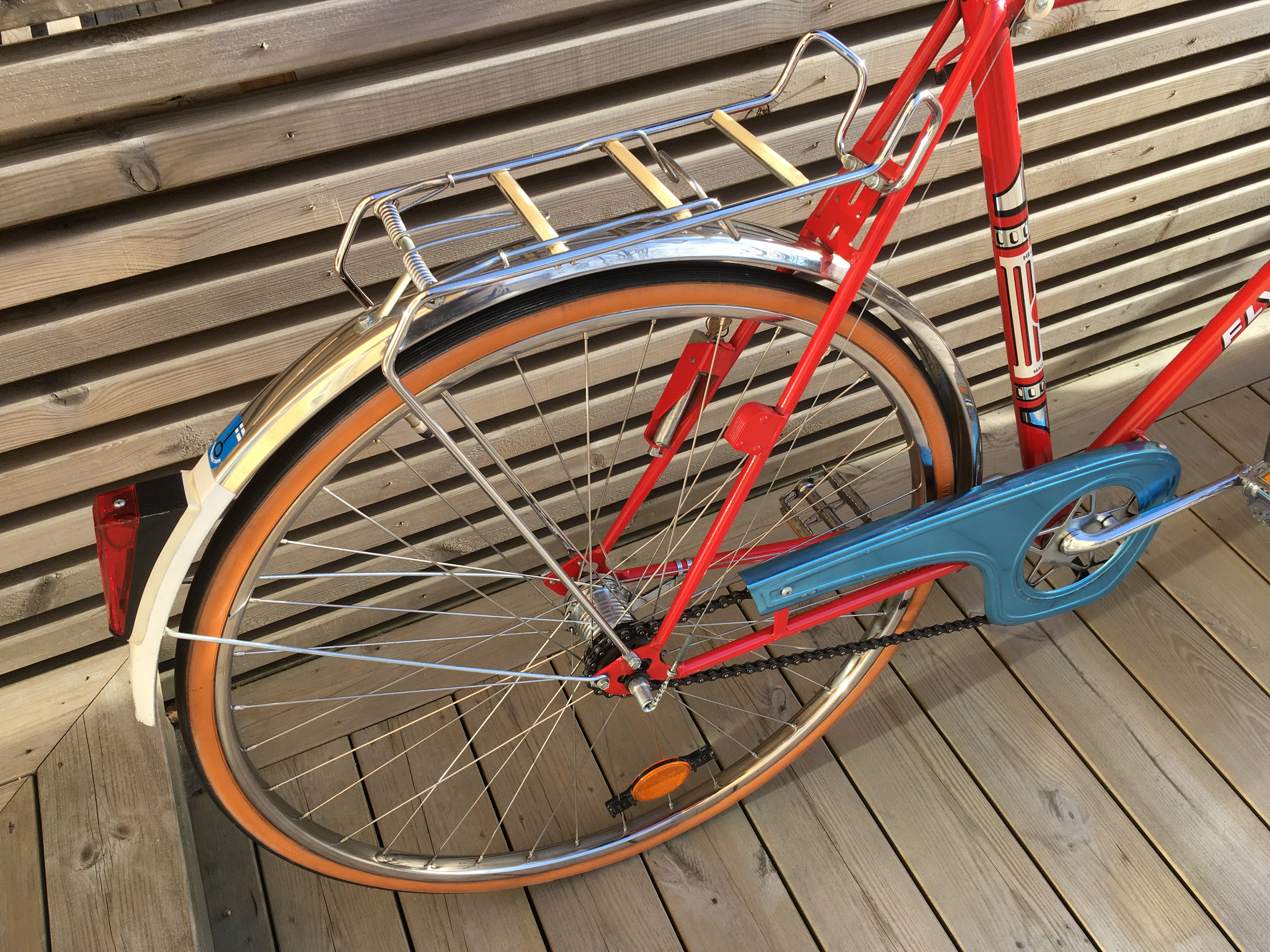 Den är nära nyskick med alla fina dekaler, gummin på pakethållaren kvar, Weinmann Semi Automatic bromsar och original Trelleborg-däck 27 x 1 1/4 tum (motsv. 32-630) som håller luften. Hela cykeln är i fantastiskt skick, jag samlar själv på cyklar, och det är inte ofta jag hittar en i det här skicket. T.o.m. skyddsplasten på kjedjeskyddet sitter kvar, likaså en varningsetikett på styrstammen!