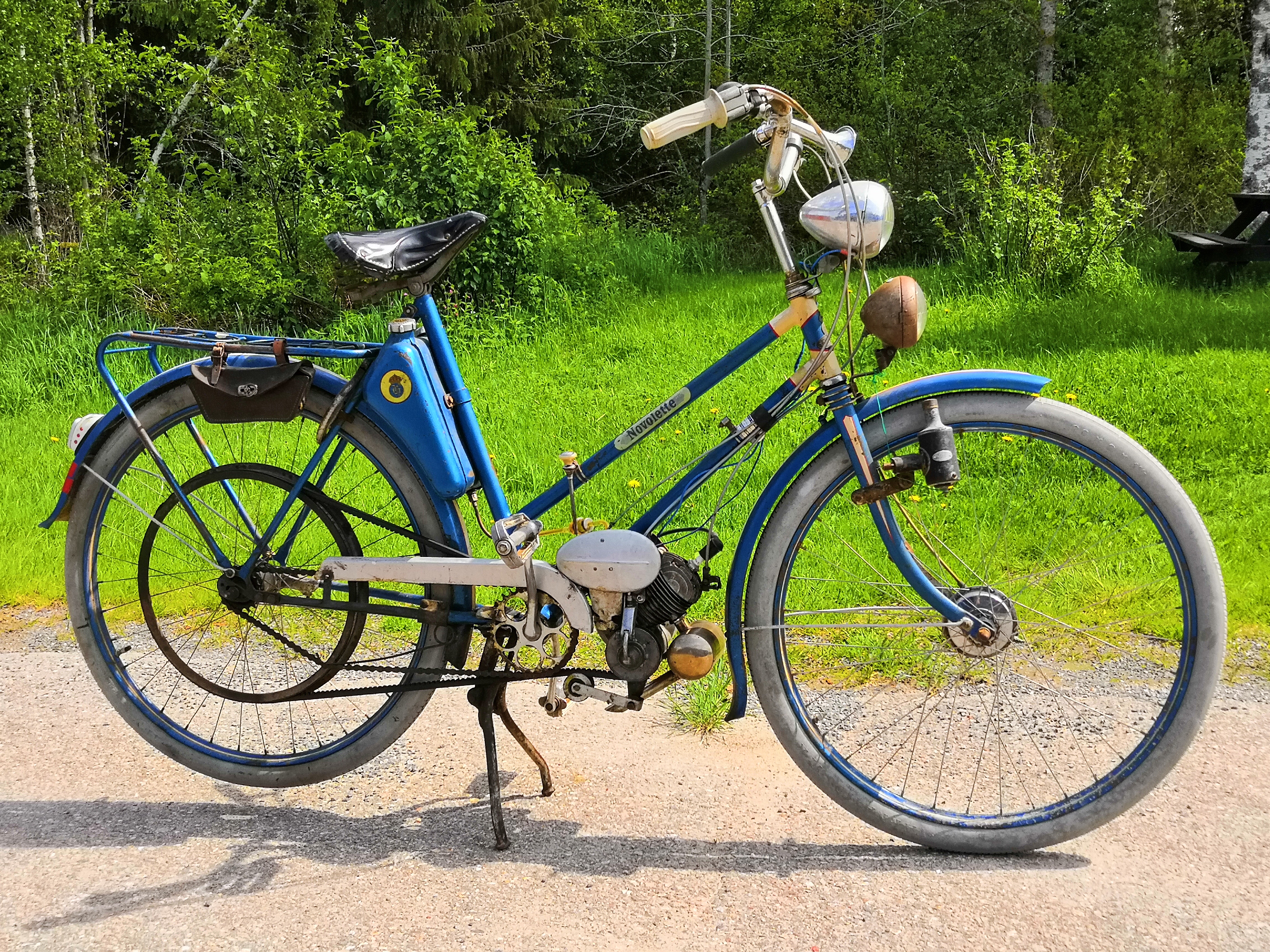 Startar gör du med att stänga luftspjället och sedan trampa iväg med högerhandtaget i framåtläge (frikopplad) och när du fått upp lite fart så vrider du handtaget mot dig så att kopplingen greppar in, men ge inte för mycket gas, den startar bättre med pyttelite gaspådrag.