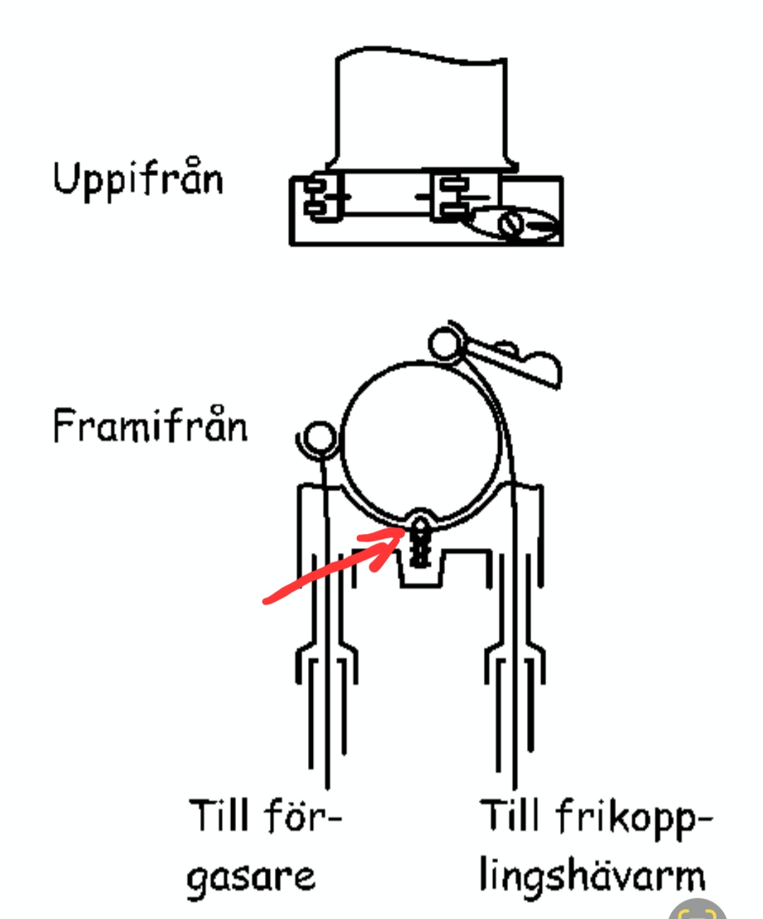 Handtaget har ju två glidnipplar, en för gas och en för koppling, och när man vrider handtaget framåt så spänns kopplingsvajern och motorn frikopplas. Vrider du sedan mot dig så kopplar den in ungefär samtidigt som gasvajern börjar att sträckas för att lyfta trotteln.